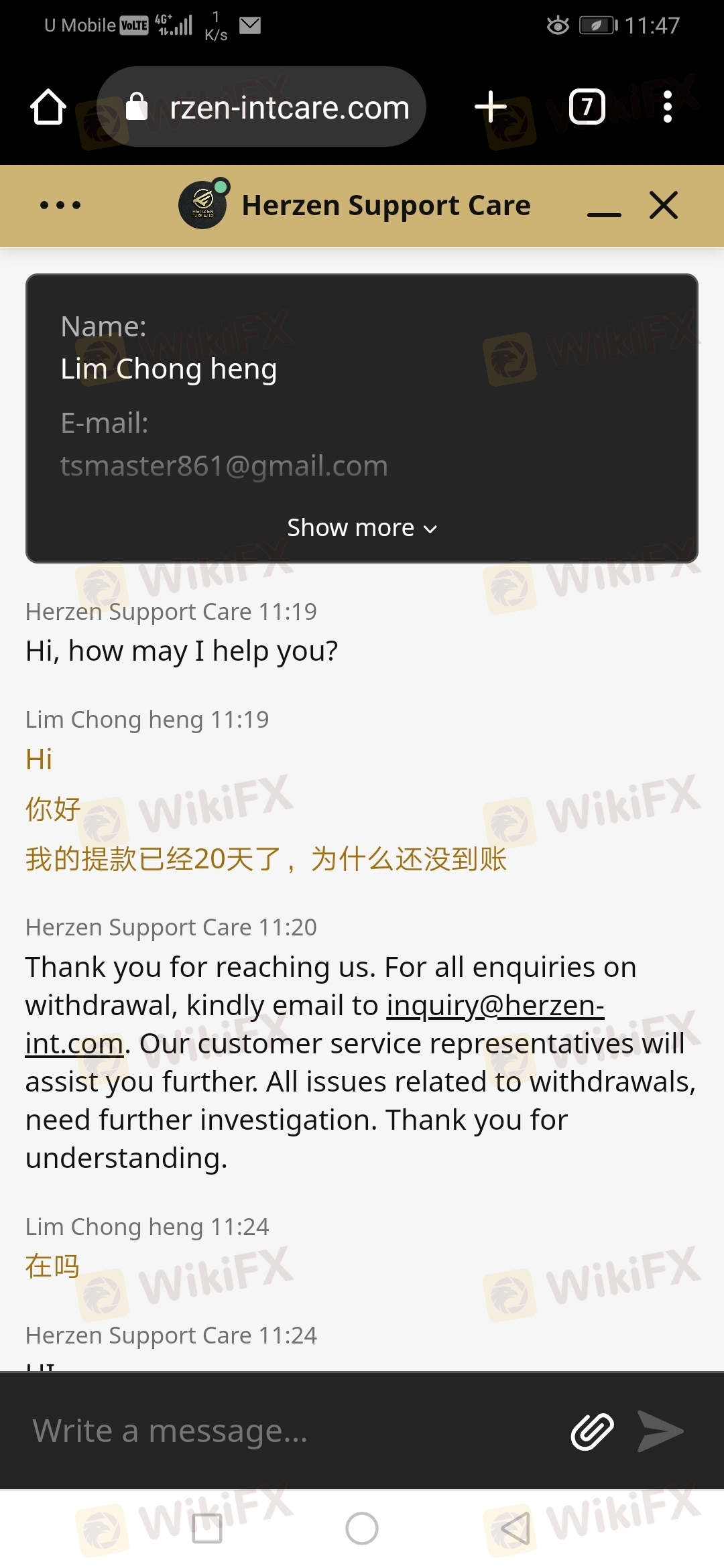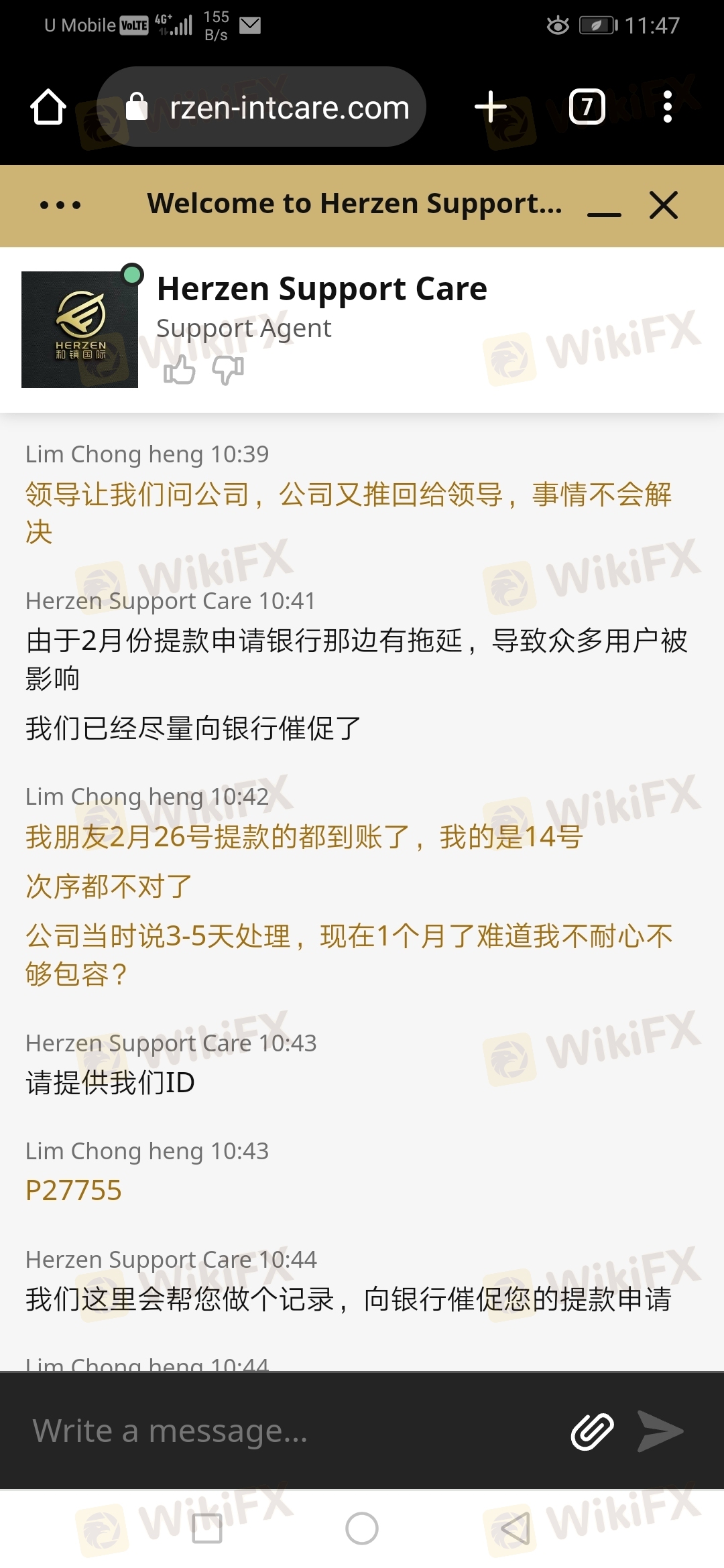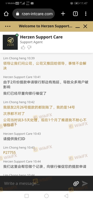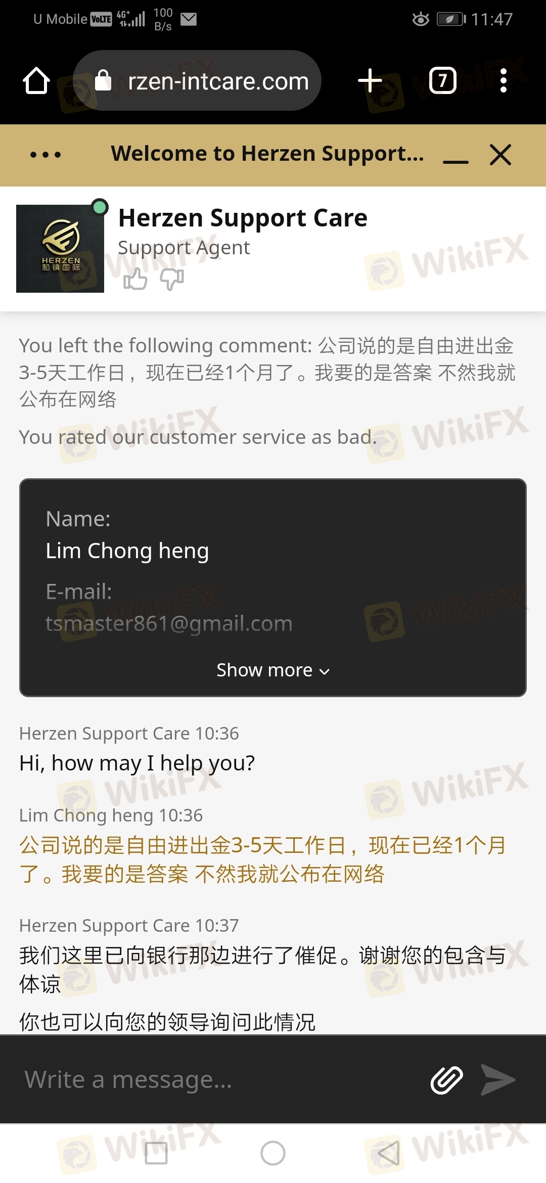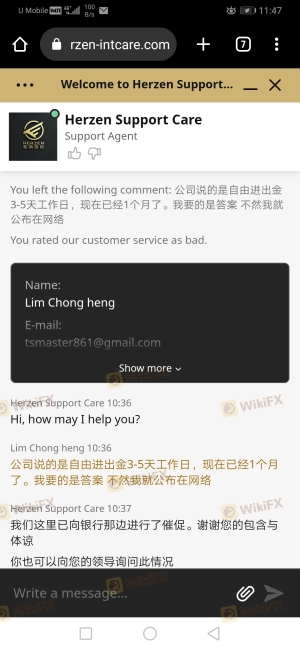 公司答应5-7工作日自由进出金,就是个骗话,我2月14日号提的本金10000,足足等了2个月,在这过程中我一直有跟公司客服follow, 但是都是踢足球上线推herzen,herzen推AIFC, AIFC更死借口多多竟然说labuan户口被冻结.看截图对话。最后一次上公司见老板给出的解决方案是把10000本金分三次拿,我也跟着做3500 3500 3000,结果等了10多天钱又没收到,只是公司发来email(email里的名字也故意写错) 要求一堆无理的出金规则,一个字 就是 赖.... 希望公司出来解决 不然我就发到社交媒体.我把以下对话跟证据全发出来