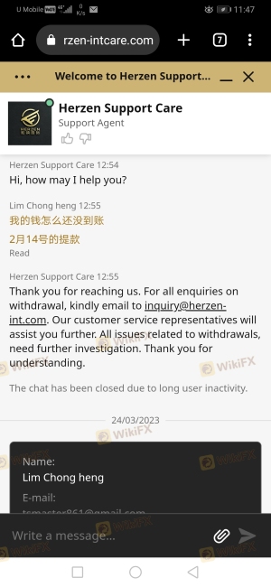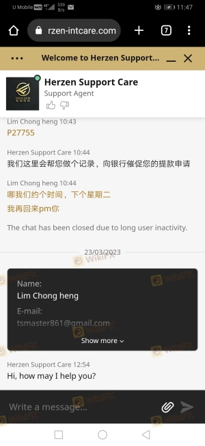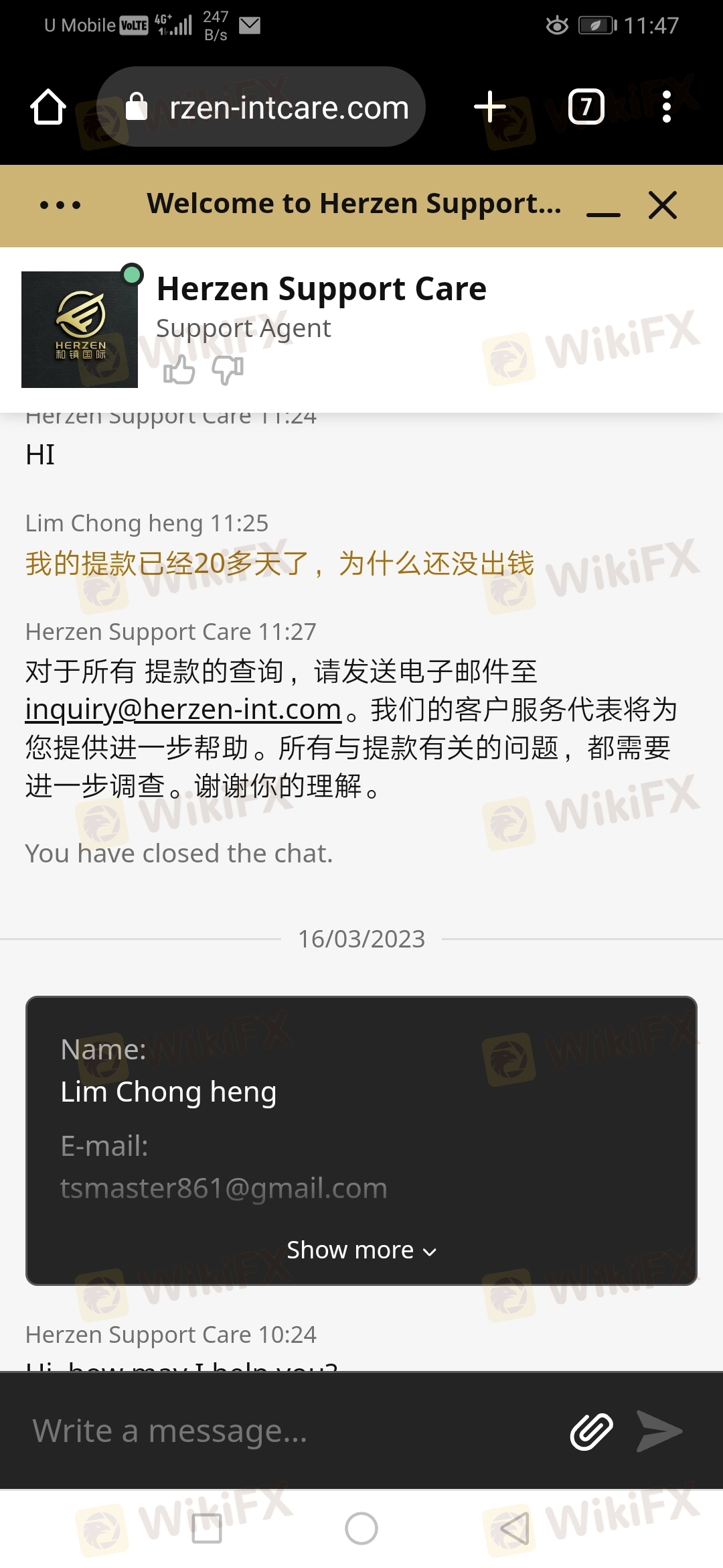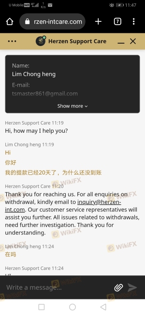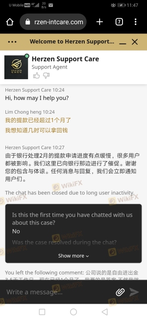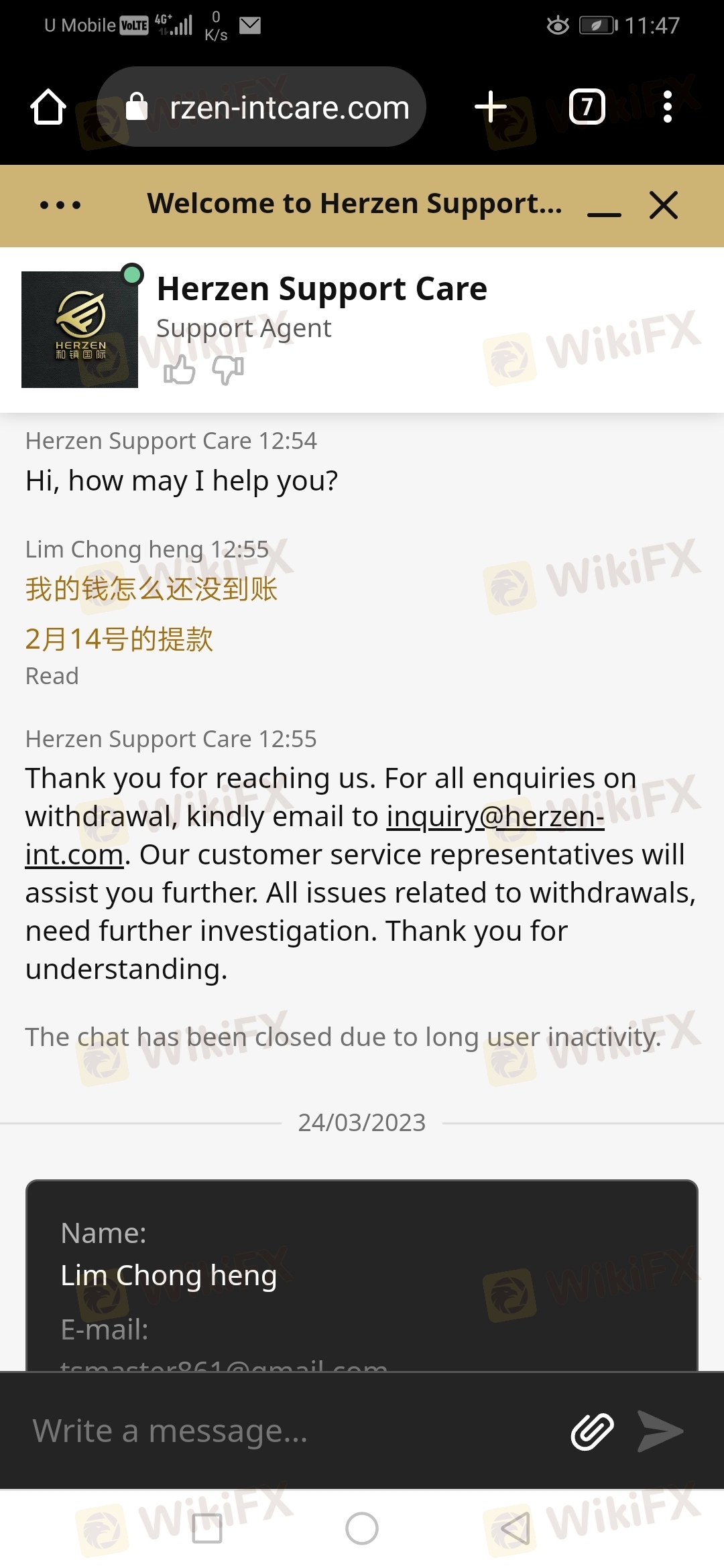公司答应5-7工作日自由进出金,就是个骗话,我2月14日号提的本金10000,足足等了2个月,在这过程中我一直有跟公司客服follow, 但是都是踢足球上线推herzen,herzen推AIFC, AIFC更死借口多多竟然说labuan户口被冻结.看截图对话。最后一次上公司见老板给出的解决方案是把10000本金分三次拿,我也跟着做3500 3500 3000,结果等了10多天钱又没收到,只是公司发来email(email里的名字也故意写错) 要求一堆无理的出金规则,一个字 就是 赖.... 希望公司出来解决 不然我就发到社交媒体.我把以下对话跟证据全发出来