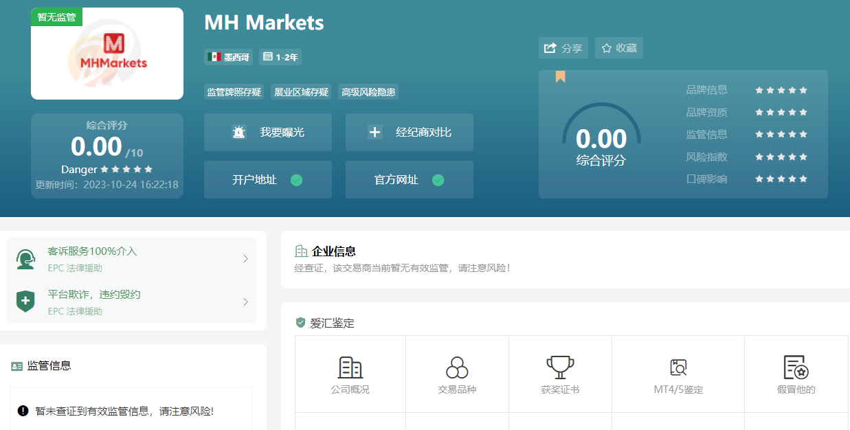爱汇查平台运用先进的大数据算法,对交易商的监管和风险水平进行科学评估。投资者可通过爱汇查平台,查看MH Markets等平台的风险评级和用户评价,全面了解平台的信誉和口碑。例如,外汇天眼(与爱汇查合作)将MH Markets的风险评级定为“高风险”,评分仅2.8分,远低于行业安全线6分,为投资者提供了明确的风险提示。
