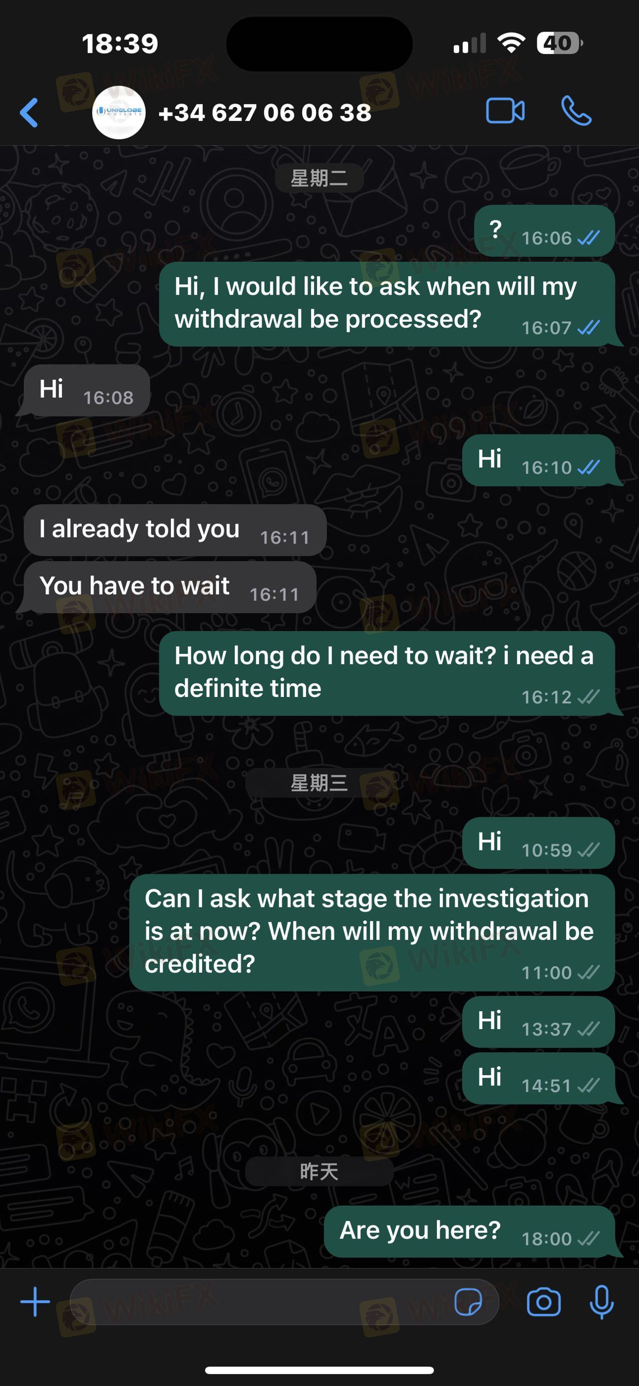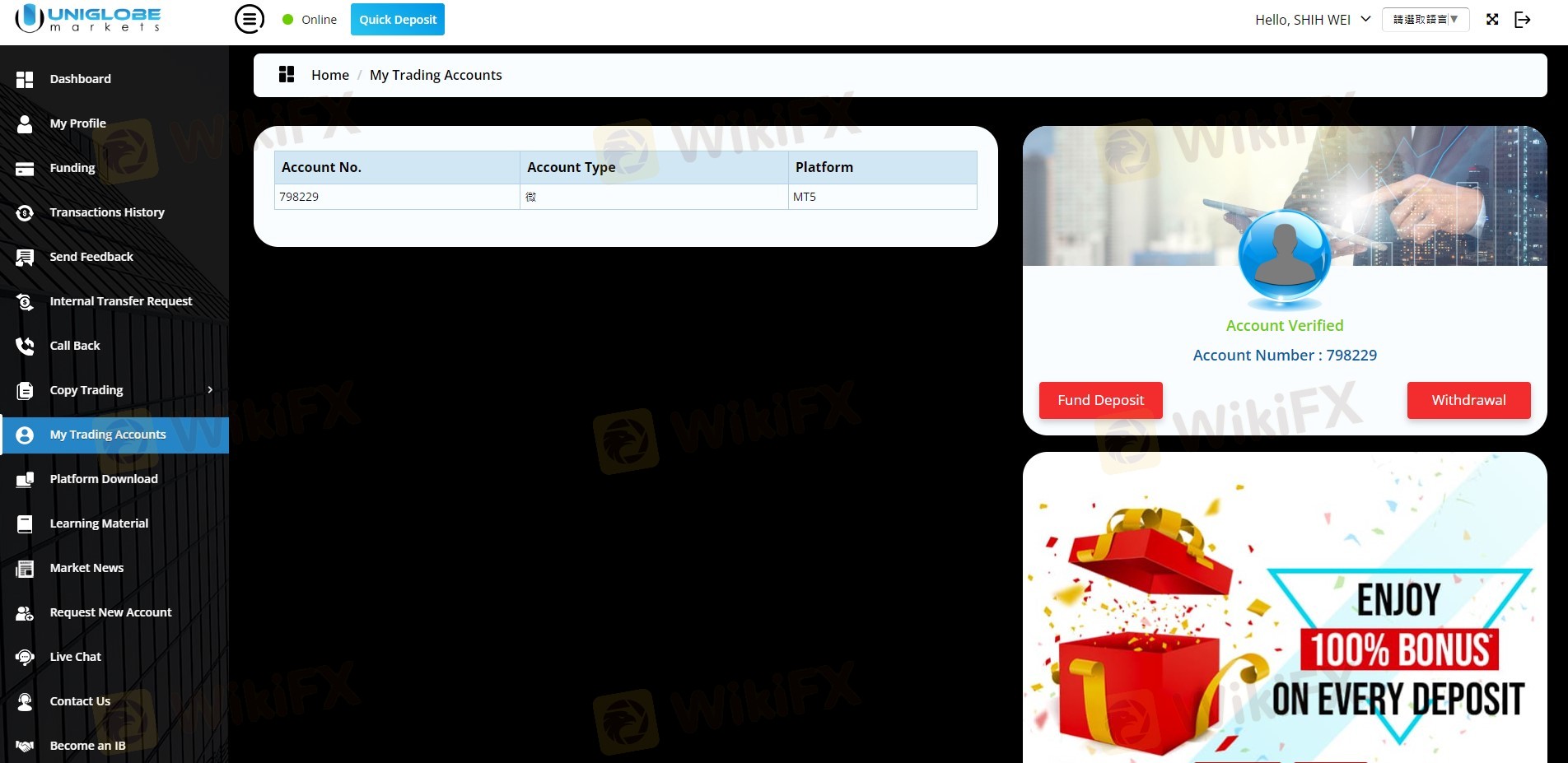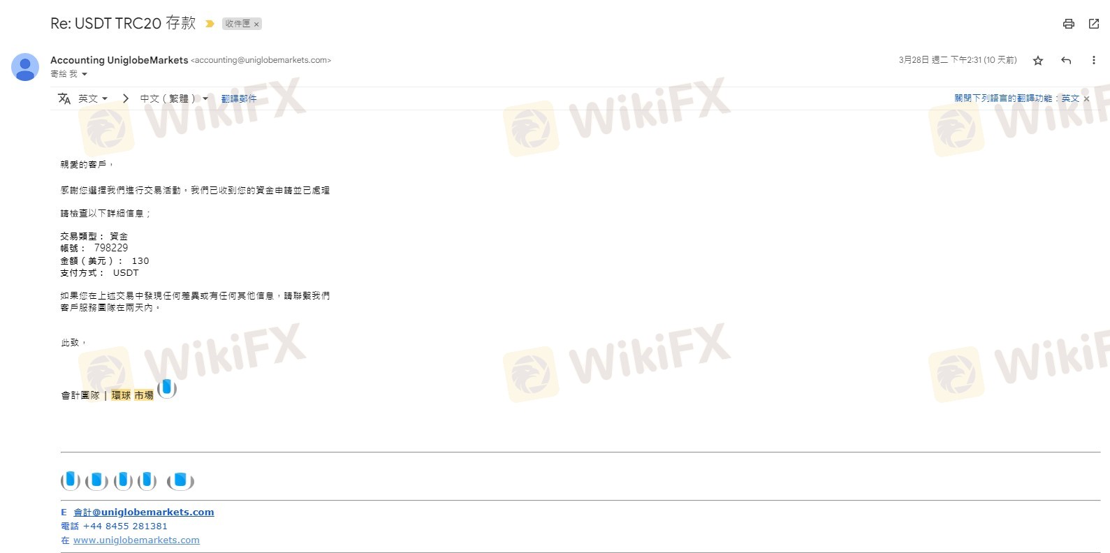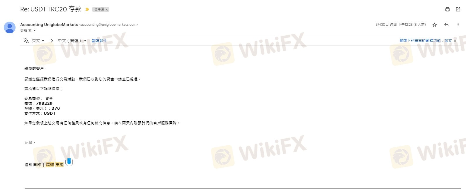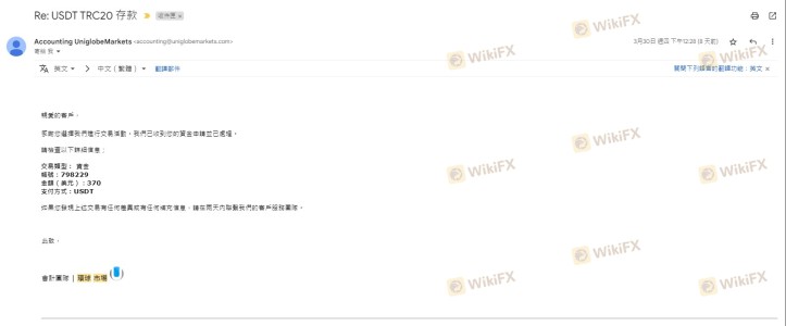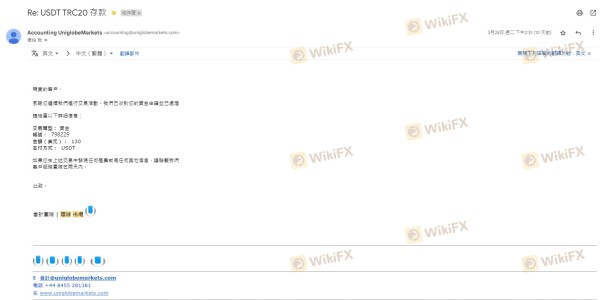 本人於2023/03/23開設uniglobemarkets交易帳戶,於2023/03/28透過USDT-TRC20入金130 USD(如附圖),並於2023/03/30透過USDT-TRC20入金370 USD(如附圖),2023/03/30透過USDT-TRC20出金534 USD,一直到今天2023/04/07都沒有處理出金,客服自2023/04/05起也不回復消息,後台也沒有顯示任何出入金紀錄,只能提供mt5紀錄