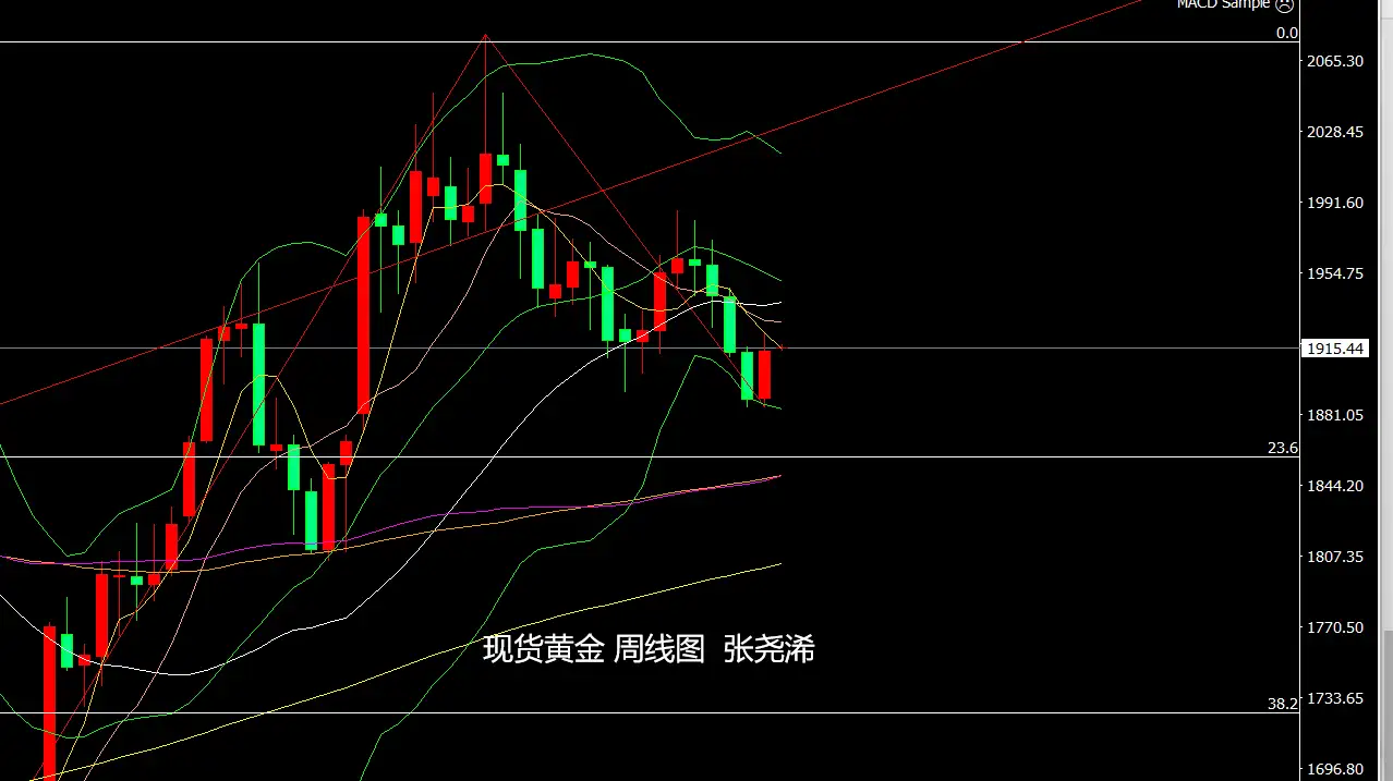 技术上:月图级别,金价目前虽又重回在1990-1890美元的震荡区间之内,并也回升至10月均线上方,但如本月收线未能收在10月均线上,则仍有再度跌破区间支撑,并进一步走低回落触及布林带中轨或30月均线支撑附近的预期;