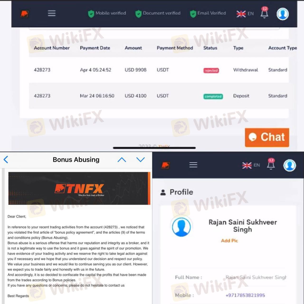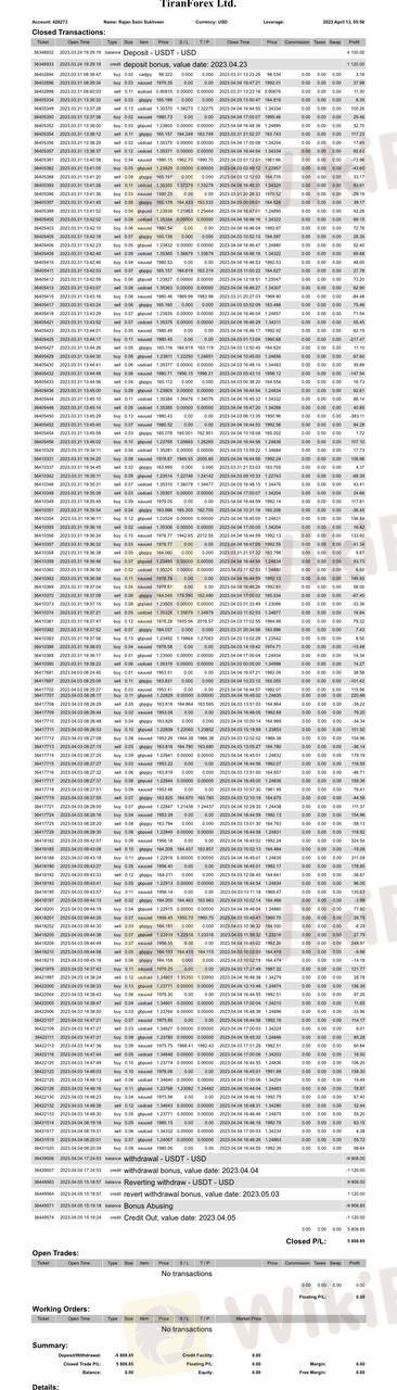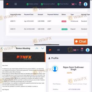 三月在朋友介绍下TNFX入金 $4100,交易后产生利润,尝试提款,TNFX直接污蔑我滥用赠金并抹除所有资金共计$9908.我让他们提供证据他们拒绝提供.交易记录我发出来所有人看看.