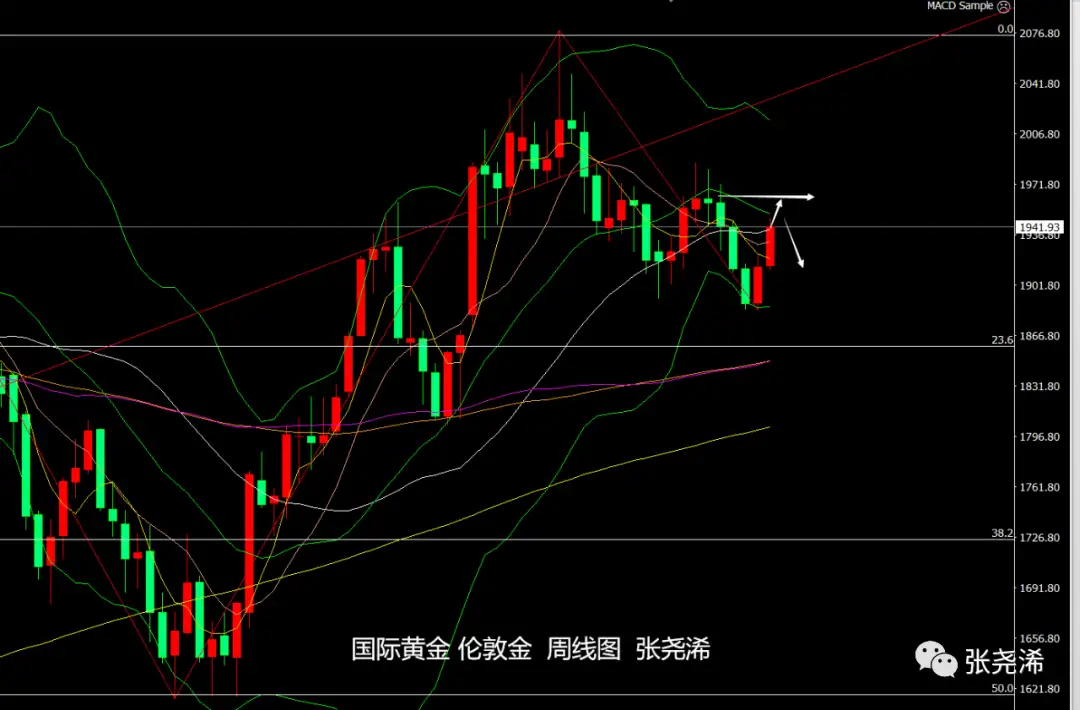 周线级别:金价本周再度反弹走强,验证了上周形成阳包阴的看涨格局,且目前正测试中轨线阻力,虽然有一定的突破动力,但是能否持稳也是未知数,上方也面临一定的趋势线压力,附图指标MACD快慢线也仍处于0轴上方,这暗示仍有看空的风险存在。走势震荡或偏冲高回落对待。