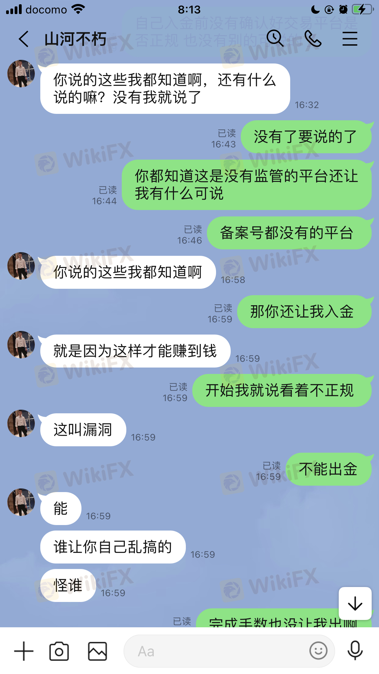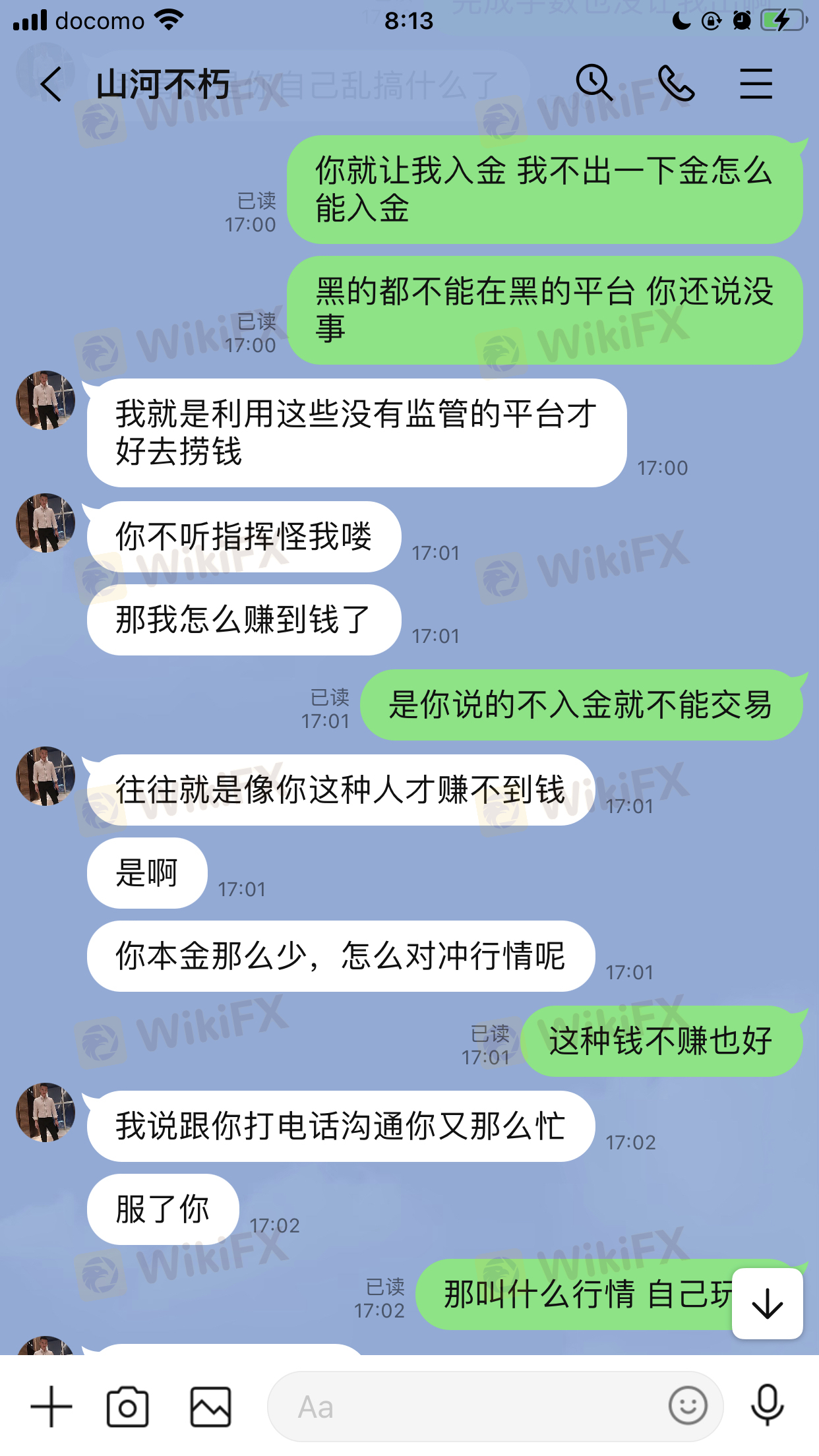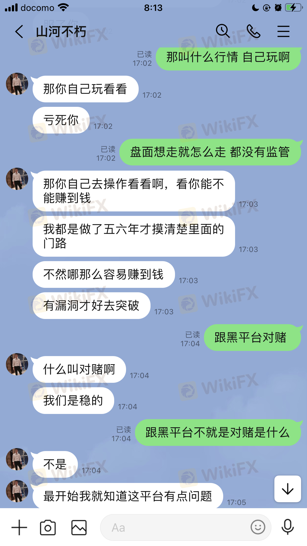 居住在新加坡的网友说开始说是个有监管的平台就试着第一次入金做一次交易后小盈利又主动教我出金 再次入金100万日元交易2次小盈利后我打算出金试试这个平台靠不靠谱 出金被拒 平台说是我的交易手数不够 我试着自己交易完成平台规定手数后平台又说我 交易时持单时间不够 我又继续做手数交易 在完成一半手数时平台急拉涨 超过同时段其他平台盘面35点 我爆仓 之后和网友联系他又说他早就知道这个平台有问题 说是利用这个黑平台漏洞赚钱 就是个大骗子 交易期间他说他规划行情我跟着超做就好 两次交易也都是盈利是在他的预期 我问过怎么能预算盈利金额呢 他说他有内幕消息 他叔叔在银监局 每次给他内幕消息所以他知道稳赚的进入交易时间和平仓时间 这时我就感觉被骗了 在天眼查到这个平台即然是没有监管的 质问他 他还狡辩 希望大家真的轻易不要相信别人带你赚外汇保赚钱的