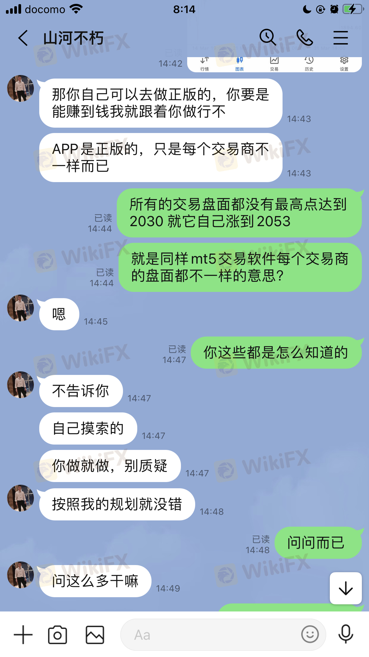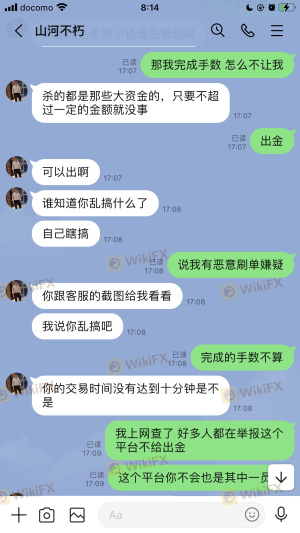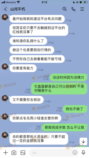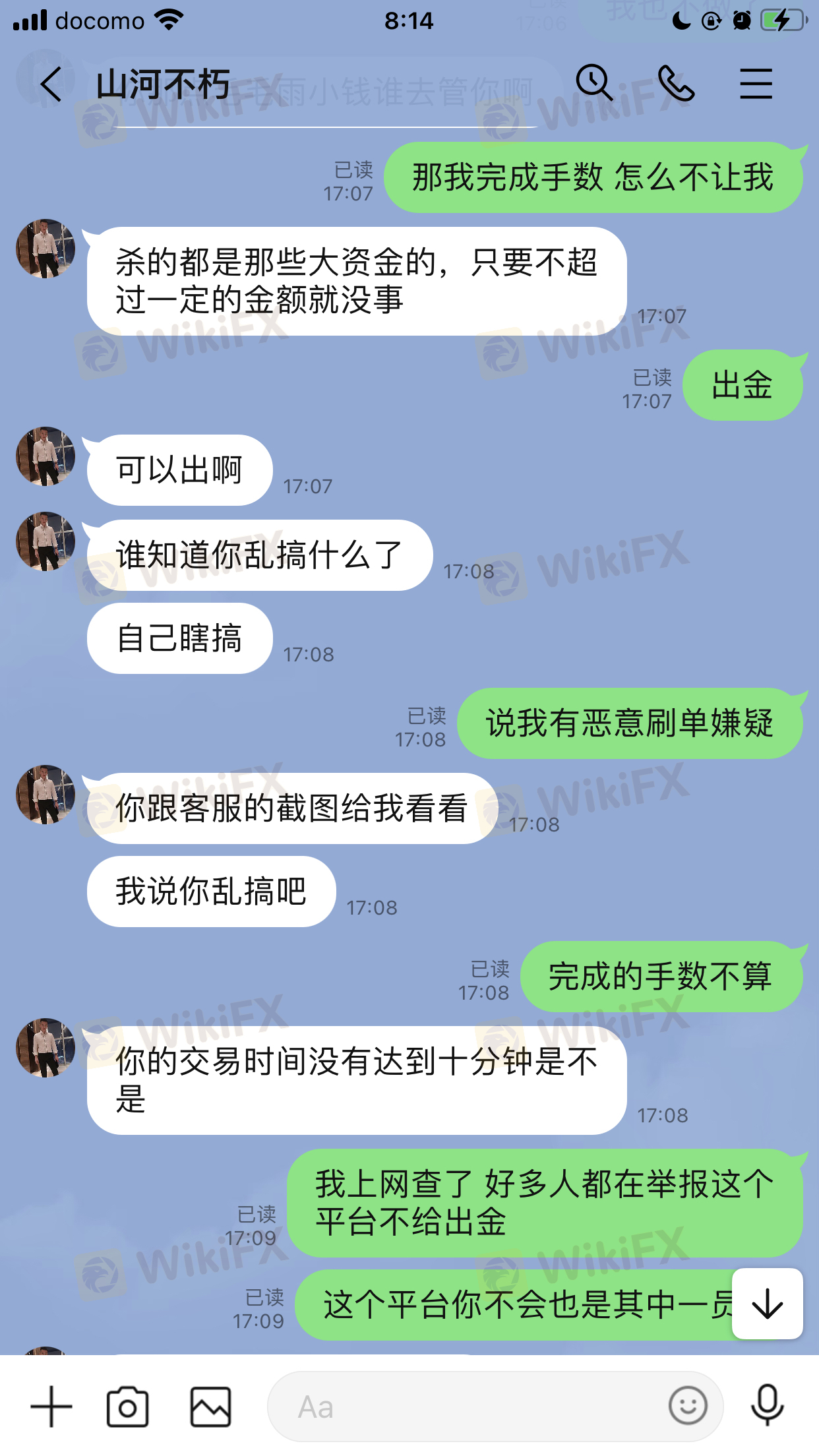 居住在新加坡的网友说开始说是个有监管的平台就试着第一次入金做一次交易后小盈利又主动教我出金 再次入金100万日元交易2次小盈利后我打算出金试试这个平台靠不靠谱 出金被拒 平台说是我的交易手数不够 我试着自己交易完成平台规定手数后平台又说我 交易时持单时间不够 我又继续做手数交易 在完成一半手数时平台急拉涨 超过同时段其他平台盘面35点 我爆仓 之后和网友联系他又说他早就知道这个平台有问题 说是利用这个黑平台漏洞赚钱 就是个大骗子 交易期间他说他规划行情我跟着超做就好 两次交易也都是盈利是在他的预期 我问过怎么能预算盈利金额呢 他说他有内幕消息 他叔叔在银监局 每次给他内幕消息所以他知道稳赚的进入交易时间和平仓时间 这时我就感觉被骗了 在天眼查到这个平台即然是没有监管的 质问他 他还狡辩 希望大家真的轻易不要相信别人带你赚外汇保赚钱的