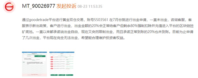 投资者B也发投诉称,自己通过GoodTrade平台进行黄金双仓交易,账号5503561。在7月份就申请出金,平台一直没有出金。于是咨询客服,客服表示平台除了新政策,出金金额的20%会正常给客户,但是剩余的80%将强制扣除并充值进入平台的区块链挖矿底池。