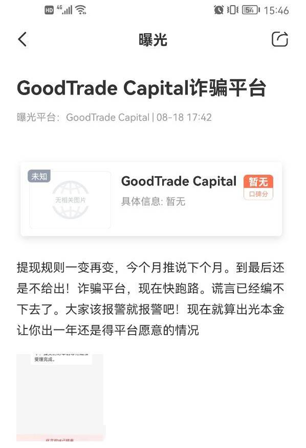 近期,爱汇查又接到关于GoodTrade Capital的投诉,投诉者称在该平台交易了一段时间,申请出金后,平台将提现规则一变再变,最后还是不给出金。看来GoodTrade Capital已经彻底“黑化”了,爱汇查再次为大家揭露该平台的真实面目。