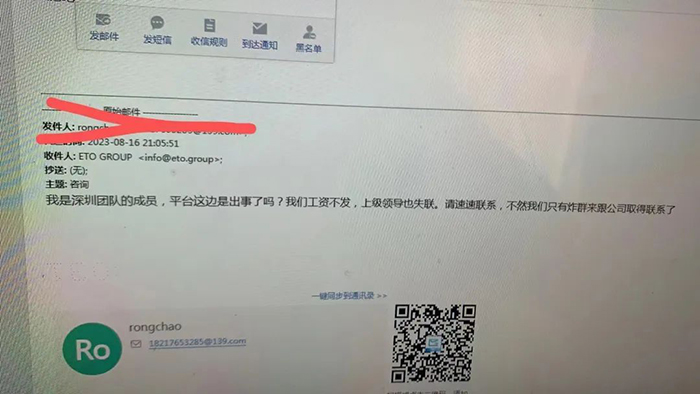 邮件的发件人是ETO Markets深圳团队的一名员工,他现在遇到的问题是公司工资不发、团队领导人也失联了。这名员工也在担心“平台这边是不是出事了”。