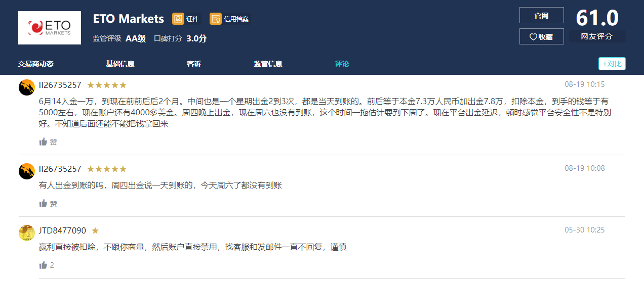 爱汇查小编收集了一些ETO Market国内用户的口碑:“盈利就告知违规,官网客服是摆设,不处理任何问题”;“出金被取消,而且没有任何通知”;“本金都吃了,账户直接禁用”……口碑并不好看,且已经持续很长时间了。