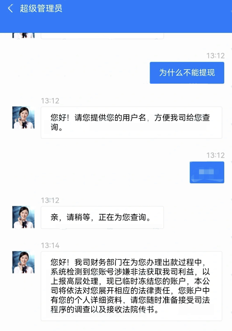汇友于是咨询平台客服无法提现原因,客服回复称:“系统检测到您账号涉嫌非法获取我司利益,已上报高层处理,现已临时冻结您的账户,本公司将依法对您展开相应的法律责任(追究)……”