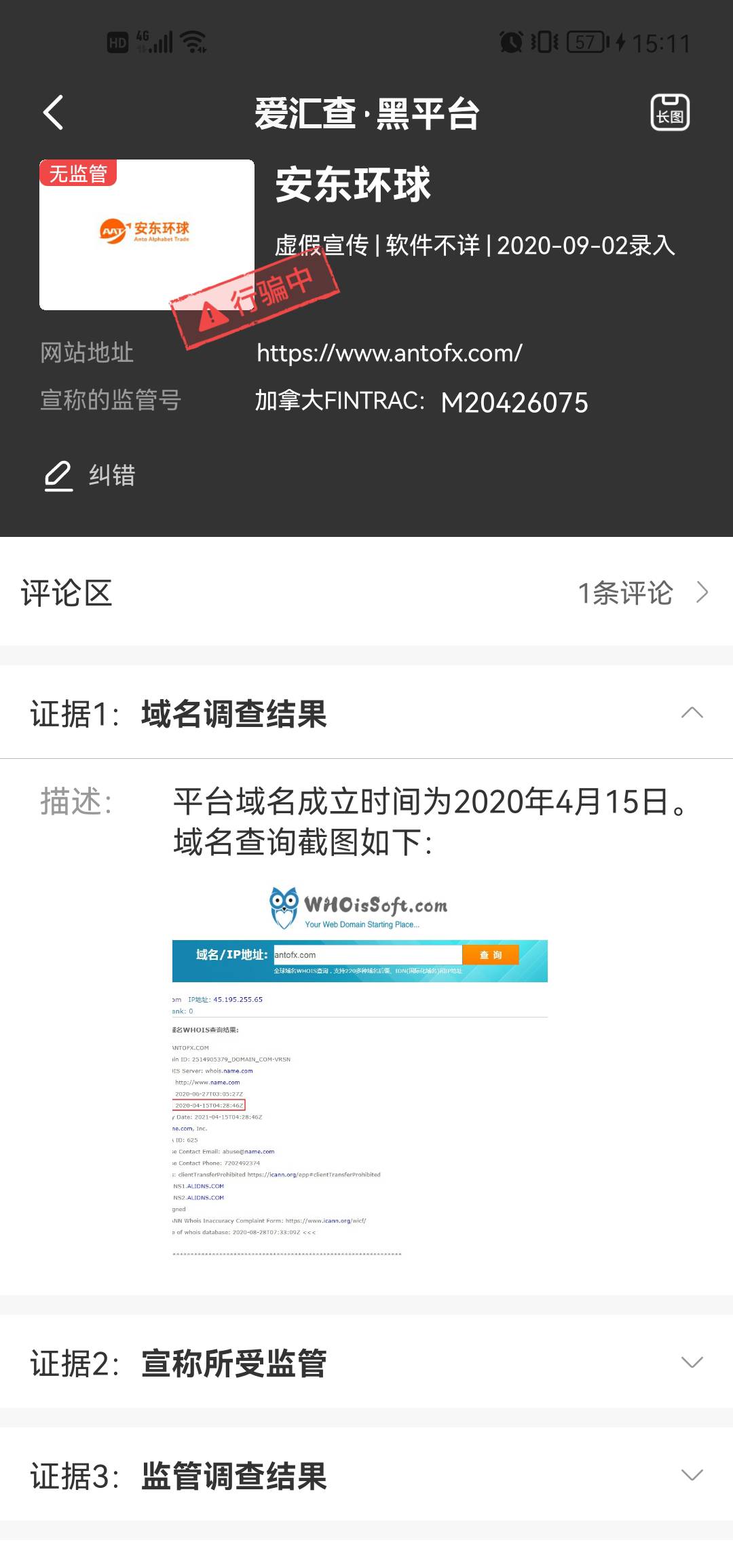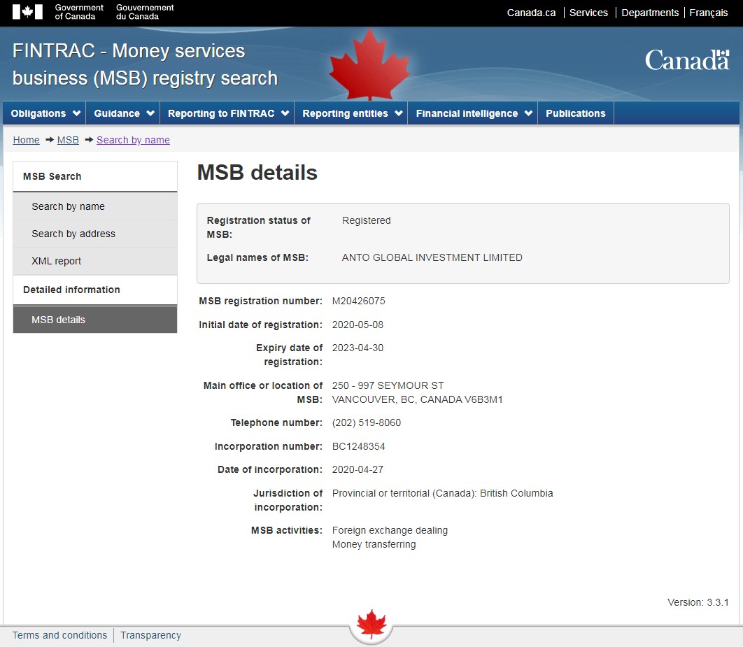 在爱汇查上,安东环球早在2020年9月被鉴定为“无监管”的黑平台,该平台自称受加拿大FINTRAC监管,监管号为M20426075。爱汇查查询后发现,加拿大M20426075对应平台名称为ANTO