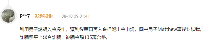 “利用男子诱骗入金操作,获利后借口再入金拒绝出金申请”,这是一位被骗74192美元(53.5万人民币)的台湾网友简单描述的被骗经过。骗他的平台名为ST5,给被骗网友的不出金理由是:“您的出金金额过大,由于您是普通会员,需您成为黄金会员后方可办理出金。”