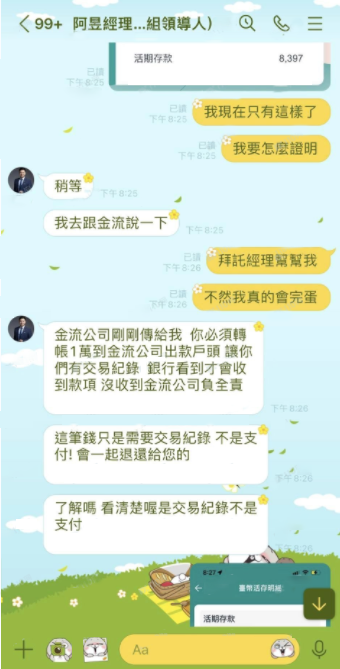 阿昱是这样回复他的:“金流公司刚刚传给我,你必须转账1万到金流公司出款户头,让你们有交易记录,银行看到才会收到款项,没有收到金流公司负全责。”而且这个经理还特别强调:“这笔钱只是需要交易记录,不是支付,会一起退还给您的”。