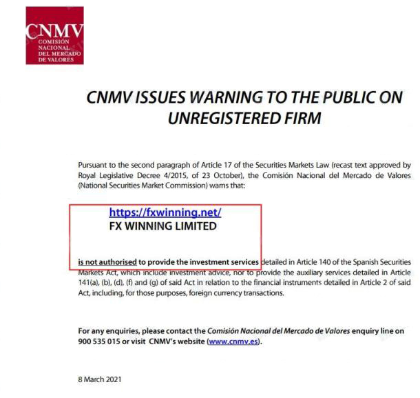 2021年3月8日,西班牙国家证券市场委员会CNMV第一次对Fx Winning平台提出警告,称其为未授权的公司;
