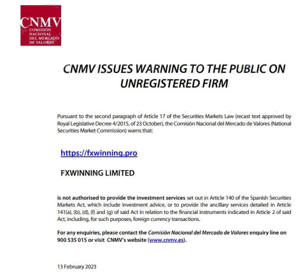 2023年2月18日,西班牙国家证券市场委员会(CNMV)再次就Fx Winning发出警告;