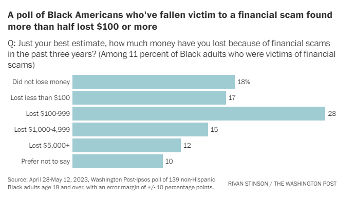 民意调查数据显示,虽然不同人口群体的诈骗受害者之间的损失金额没有太大差异,但美国黑人之间存在一些差异。收入较低的美国黑人更有可能成为受害者:家庭收入低于5万美元的黑人中有 15% 表示自己成为金融骗局的受害者,而收入在5万至10万美元的黑人中这一比例为 10%,收入在10万美元以上的黑人中这一比例为 7%。