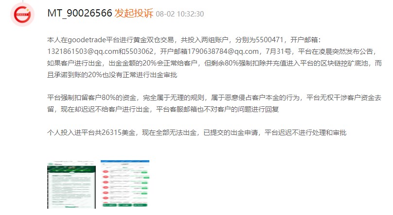 GoodTrade平台强制扣留客户80%的资金,完全属于无理的规则,属于恶意侵占客户本金的行为,平台无权干涉客户资金去留。且公告中所说的账户资金的20%也迟迟不给客户出金,平台客服邮箱也不对客户的问题进行回复。