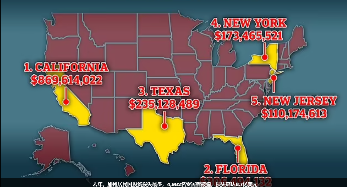 但今年目前,美国投资欺诈律师Carlson Law的研究发现,最大的损失来自金州,其次是佛罗里达州、德克萨斯州、纽约州和新泽西州。具体来说,佛罗里达州居民在诈骗中约损失 3.06