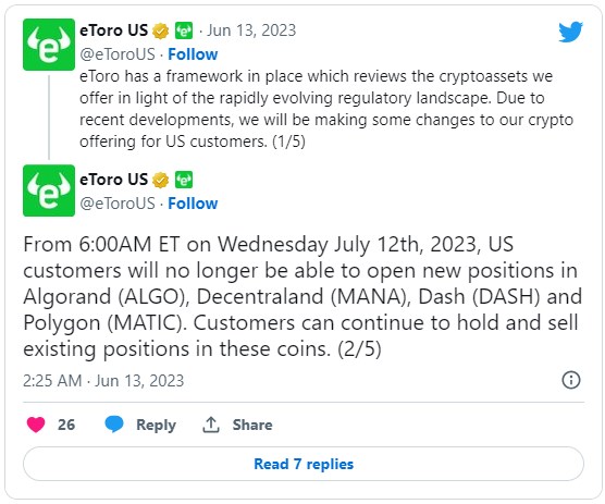 “由于美国有关加密货币的法律和法规不断变化,我们的美国加密服务提供商已决定将这些代币下架。因此,我们将无法再处理您对这些代币的买卖订单。”Revolut告诉其客户。