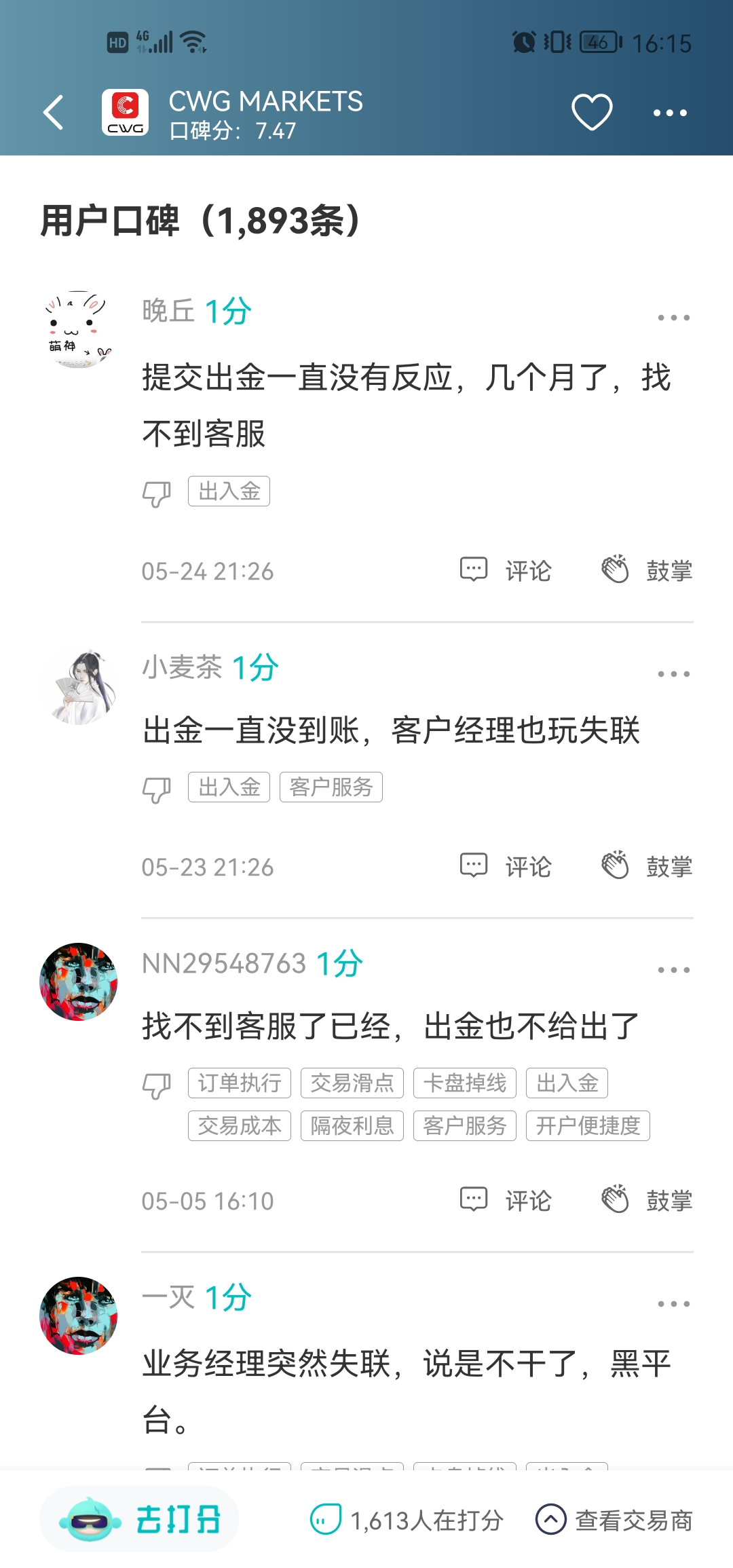 近期,爱汇查留意到CWG Markets平台的客诉高起,不是无故扣除客户盈利,就是冻结客户资金,甚至还出现威胁客户的情况,在客户并未违反交易规则的前提下,这类事件暴露出了平台服务及运营方面存在的问题,直接影响平台的口碑和资质。因此,大家在入金前,审查平台的资质和交易规则十分重要。