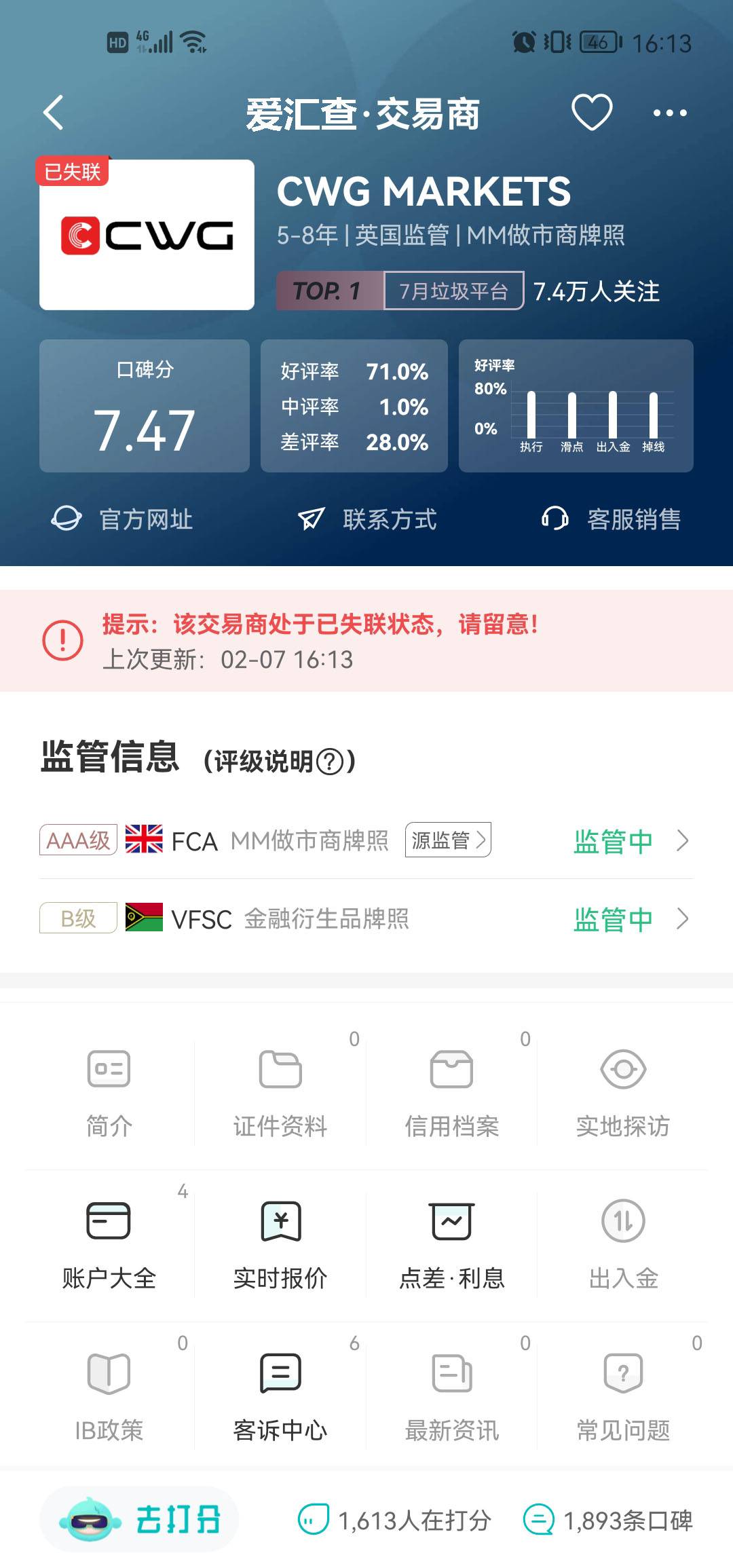 需要指出的是,英国账户有可能把订单对冲到市场上,而离岸监管通常是做对冲,不进行交易。因此,CWG Markets受到瓦努阿图的监管,需要引起投资者的关注和注意。
