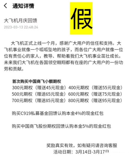 爱汇查曾经报道过,不少理财诈骗中不法分子,打着央企和国家重大项目、重大工程的旗号,招摇撞骗。日前,大飞机微信公众号发布的《关于不法分子假冒中国商飞名义行骗的严正声明》称,有不法分子假冒中国商飞开发一款名为大飞机APP程序,并在其中发布中国商飞小额期权、中国商飞股份期权、ARJ21私募基金、C919私募基金、CR929小额基金等虚假投资理财项目。
