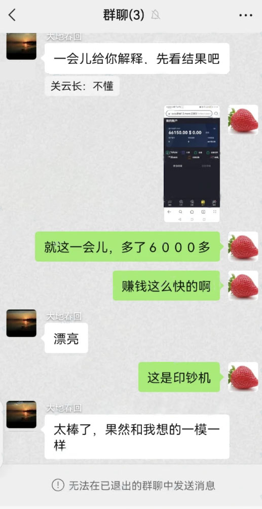 只一小会儿就赚了6000块,网友本以为自己有幸遇到了印钞机,直到自己被移出群聊,本金却无法取出,他才明白自己是被当做了榨资机。