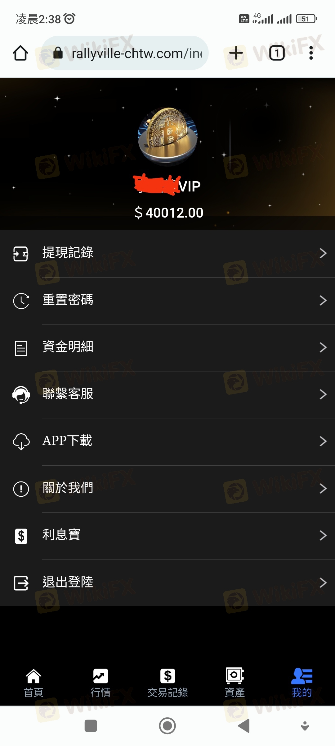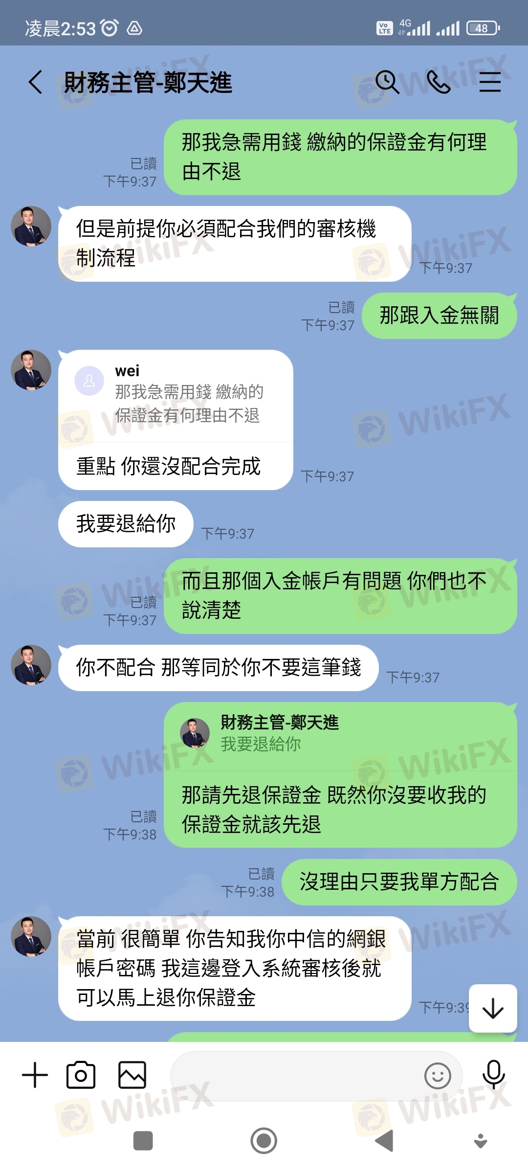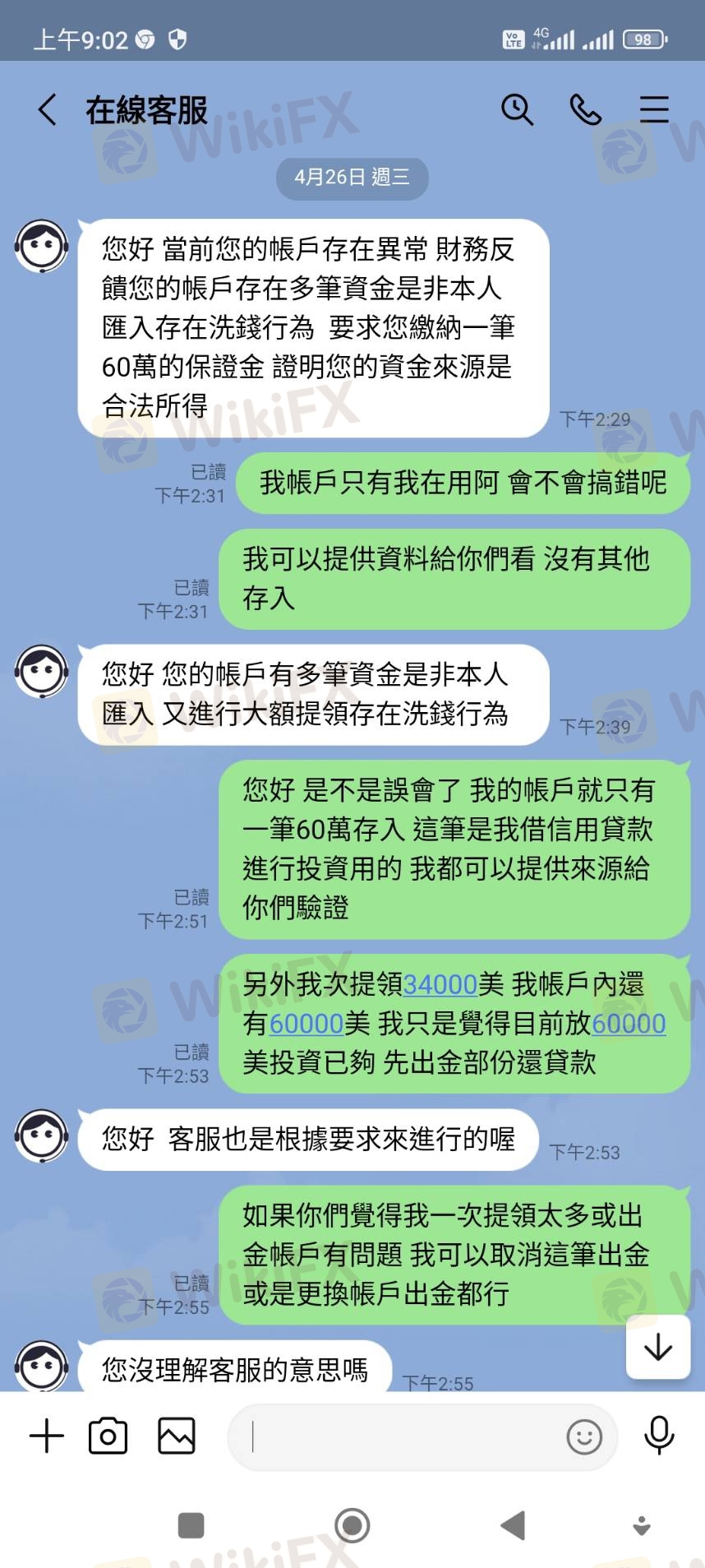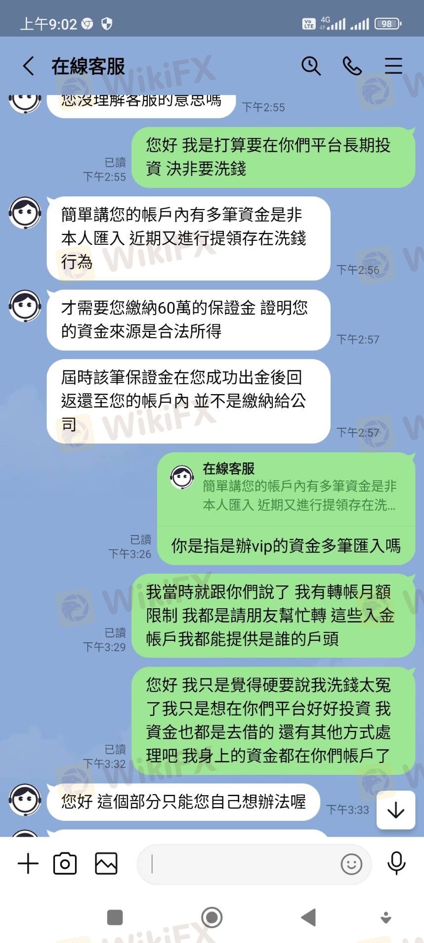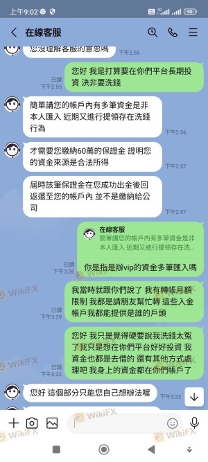 整件事情於今年3月21日,本人在某交友網站認識一位網友,後來聊到投資外匯,因本人原本就有投資的習慣,該名網友就推薦我在這賴利維爾平台下單。 這平台是以美元計價,新台幣及美元比例為1:30,一開始我只是投入少少的400美元,一開始就有獲利,後來投入的資金也越來越多,該名網友跟我說可以申請VIP客戶,他說申請成為VIP客戶,可有提領出金免手續費的優惠。 我就去跟該平台客服申請成為VIP會員,客服只跟我說申請期間不能出金不能取消,我覺得無所謂就答應申請,但在申請隔天該平台客服才告知我要我再入金20000美元才能申請成功,我立刻跟客服反映我沒有那麼大筆資金請幫我取消申請,該平台不願意幫我取消,只要我自己想辦法,不然就是無法出金。因為我銀行帳戶有月額度及每日轉帳限制,我就去跟客服要求這20000美元入金我有部分要請別人從他的帳戶轉入該平台提供的帳號,該平台也沒意見可以,就這樣我跟我們就轉入20000美金後,第一次也是唯一一次順利出金550美元。 後來我又繼續投入大筆資金大約有70萬台幣進行外匯買賣,在4/25提出要出金34000美元,隔日就被該平台告知我在洗錢,要我必須在48小時內繳納60萬台幣保證金,否則帳戶會被凍結,我當然覺得莫名其妙,跟該平台多次反映都無效,最後只好被逼同意繳納保證金,但因為我個人帳戶轉帳有額度限制,就一天轉20萬台幣後給該平台,繳納20萬台幣後因女友出事,急需現金,我再次跟該平台反應保證金我也繳20萬台幣了,我急需救命金,請該平台即刻出金,該平台就拒絕了,經多次跟該平台客服反應沒結果,最後客服把我轉給他們的財務主管,說要我跟主管協商,他們的財務主管要求我要提供有照片證件、帳戶封面、綁定約定帳戶及我的網銀帳密給他們登入審核,我拒絕並要求先退還保證金29萬,該平台就威脅我不協商配合,後結果自負,,我沒辦法也只能循法律途徑解決並將整件事曝光於外匯天眼。 我目前在該平台總共還有94012美元及繳納的保證金20萬台幣被無故扣留不出金,折合台幣大約300多萬,我選擇把整件事情曝光讓廣大投資人知悉及認清該平台,整件事情,就針對該平台無故說我洗錢,又提不出我洗錢證據,便以此為藉口不願出金,我也表示,當初也是該平台同意我的身及VIP資金可以部份由朋友帳戶匯入,匯入後也未告知有任何異常,遂在我要求部分出金時阻撓,我也說明我願意提供所有匯入帳號資料及接受警方調查,該平台人不願出金,還,很明顯地為黑平台