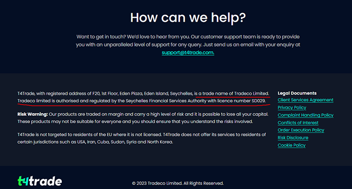 打开T4Trade官网的www.t4trade.com,看到的是一个黑、绿、白为主色调的简洁、美观的网站。在自我介绍中,T4Trade称注册地址在“Seychelles(塞舌尔)”,是Tradeco Limited公司的商号,由塞舌尔金融服务管理局授权和监管,牌照号为 SD029。