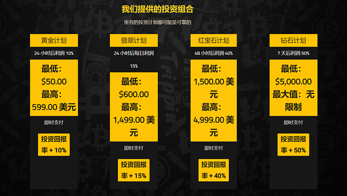 另外,Ventrade在官网设计上简单大方且不乏科技感,在头部显著位置称:“我们的信托管理原则是使用您的投资与比特币进行交易。平均每月收入从80%到130%,其中一般(40-65%)归投资者所有……”展示的几个投资组合中,黄金计划24小时候利润10%,翡翠计划24小时后每日利润15%,红宝石计划48小时后利润40%,钻石计划7天利润50%,高得离谱,明眼人一看就知道不可信。