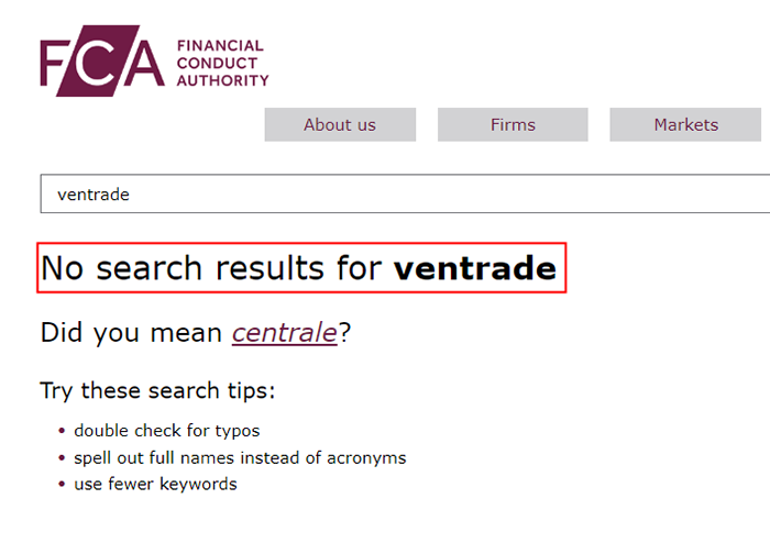 Ventrade的官网没有公开自己的任何牌照信息,但公司地址显示是在英国伦敦。但在英国的监管机构FCA搜索“ventrade”,却没有找到匹配结果。可见,Ventrade是一个无监管的黑平台。