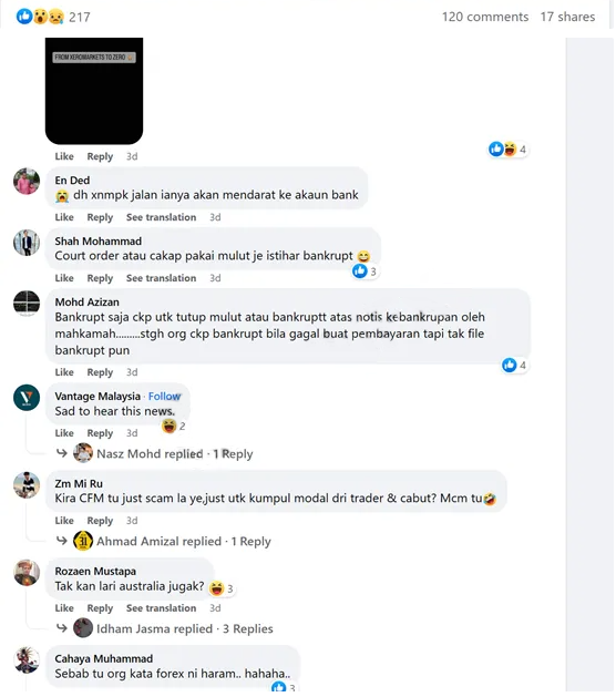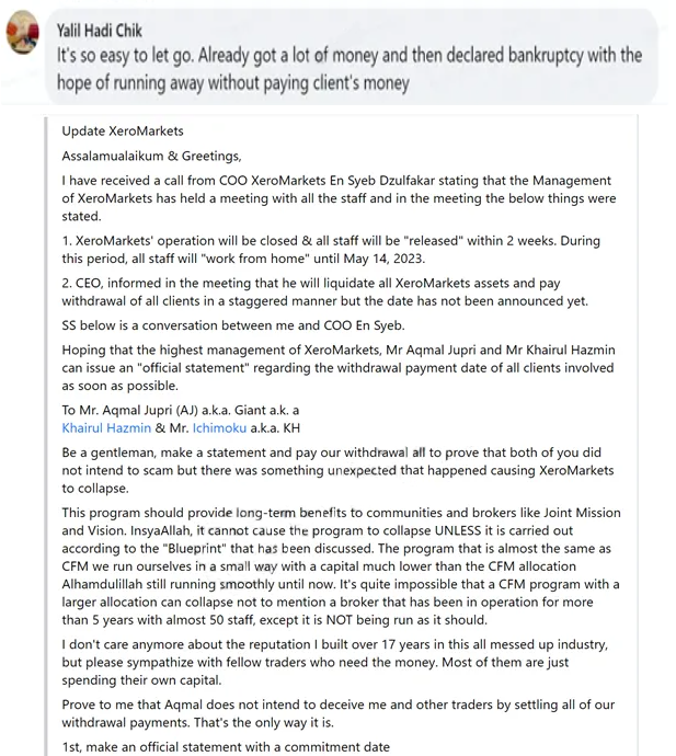 “Be a gentleman, make a statement and pay our withdrawal all to prove that both of you did not intend to scam but there was something unexpected that happened causing XeroMarkets to collapse.(做一个绅士,发表一份声明,并支付我们的提款,来证明我们没有打算诈骗,但发生了一些意想不到的事情,导致XeroMarkets破产。)”