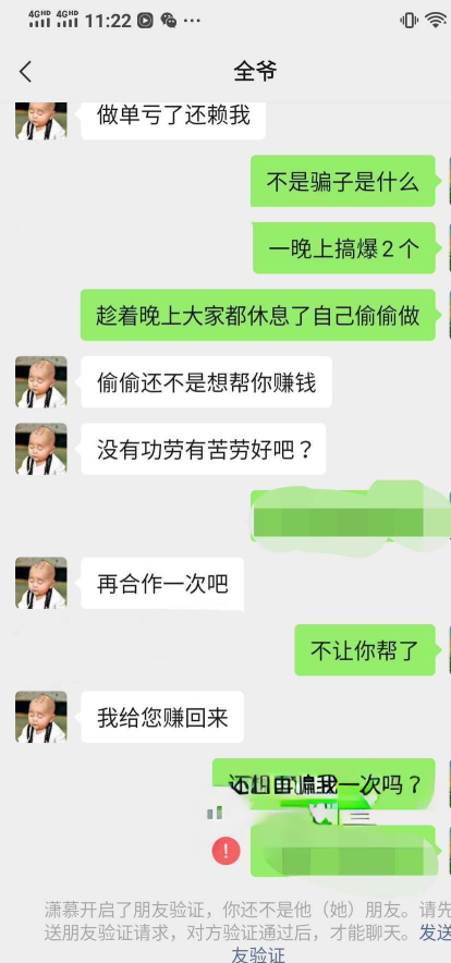 最后,该“黑代理”可能同时代理了好几个平台行骗,手法差不多。当有受害者发现其中猫腻,向该“代理”申诉,对方的回答令人“大跌眼镜”:“做单亏了还赖我?”,当用户挑破其晚上偷偷做单的事实,“黑代理”厚颜无耻地回答:“偷偷(做单)还不是想帮你赚钱,没有功劳有苦劳好吧?”