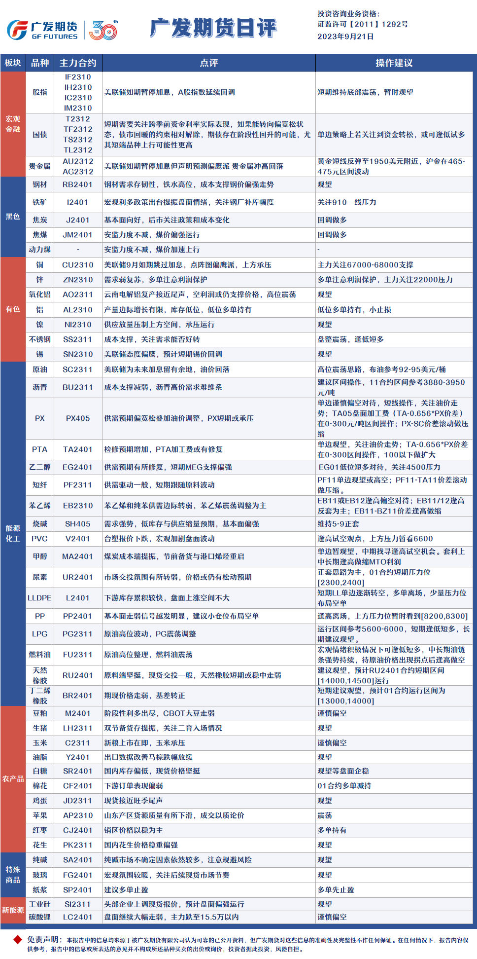 广发期货发布9月21日日评,称美联储如期暂停加息但声明预测偏鹰派,贵金属冲高回落;铁矿关注910一线压力,煤焦回调做多;锌多单注意利润保护,主力关注22000压力;铝低位多单持有,小止损;不锈钢盘整整理,逢低短多;原油高位震荡整理,布油参考92-95美元;纸浆多单先止盈。