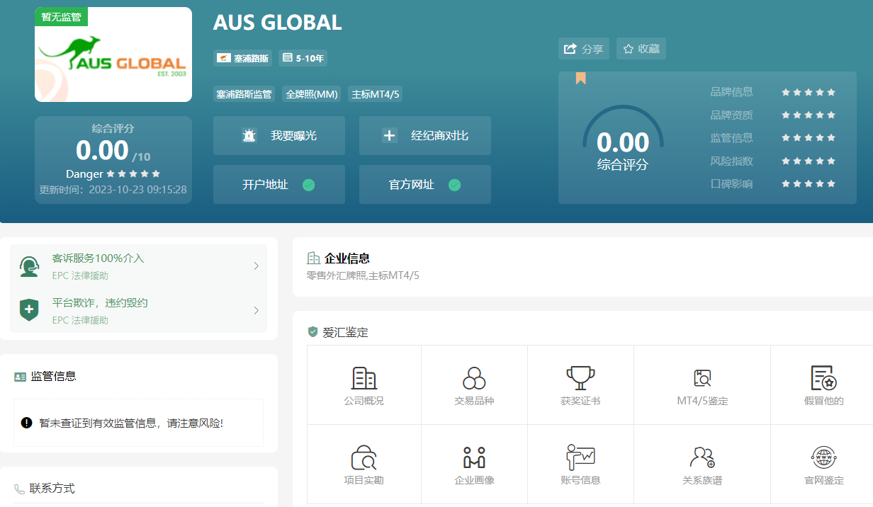 爱汇查平台运用先进的大数据算法,对交易商的监管和风险水平进行科学评估。投资者可通过爱汇查平台,查看AUS Global等平台的风险评级和用户评价,全面了解平台的信誉和口碑。例如,爱汇查将AUS Global的风险评级定为“高风险”,评分远低于行业安全线,为投资者提供了明确的风险提示。