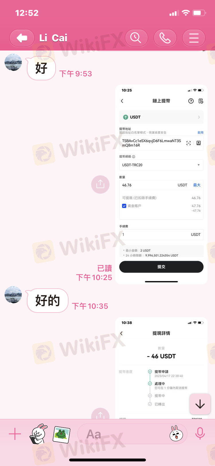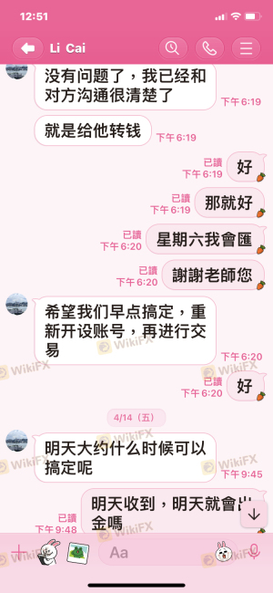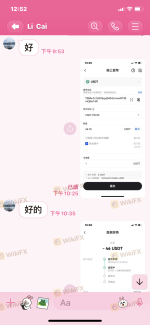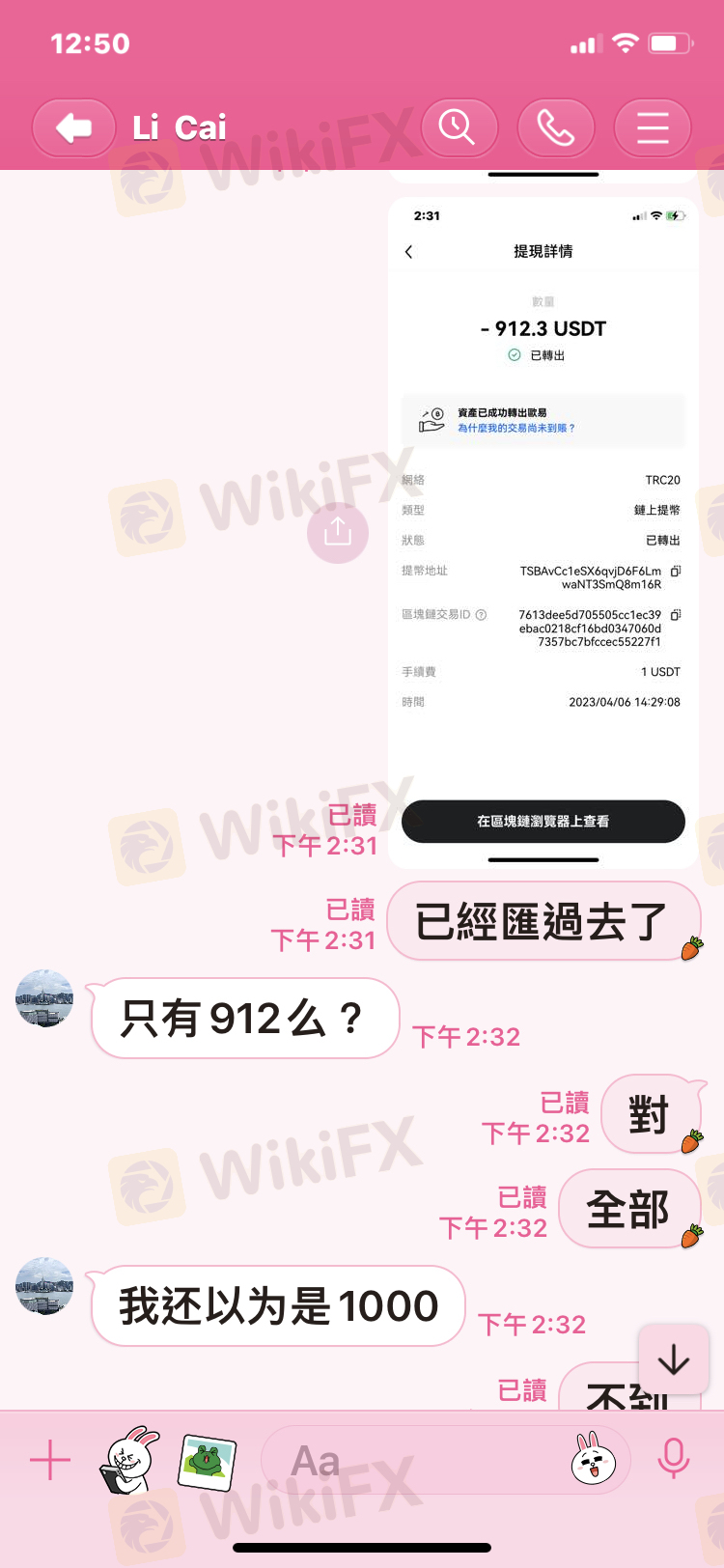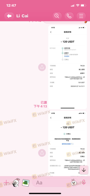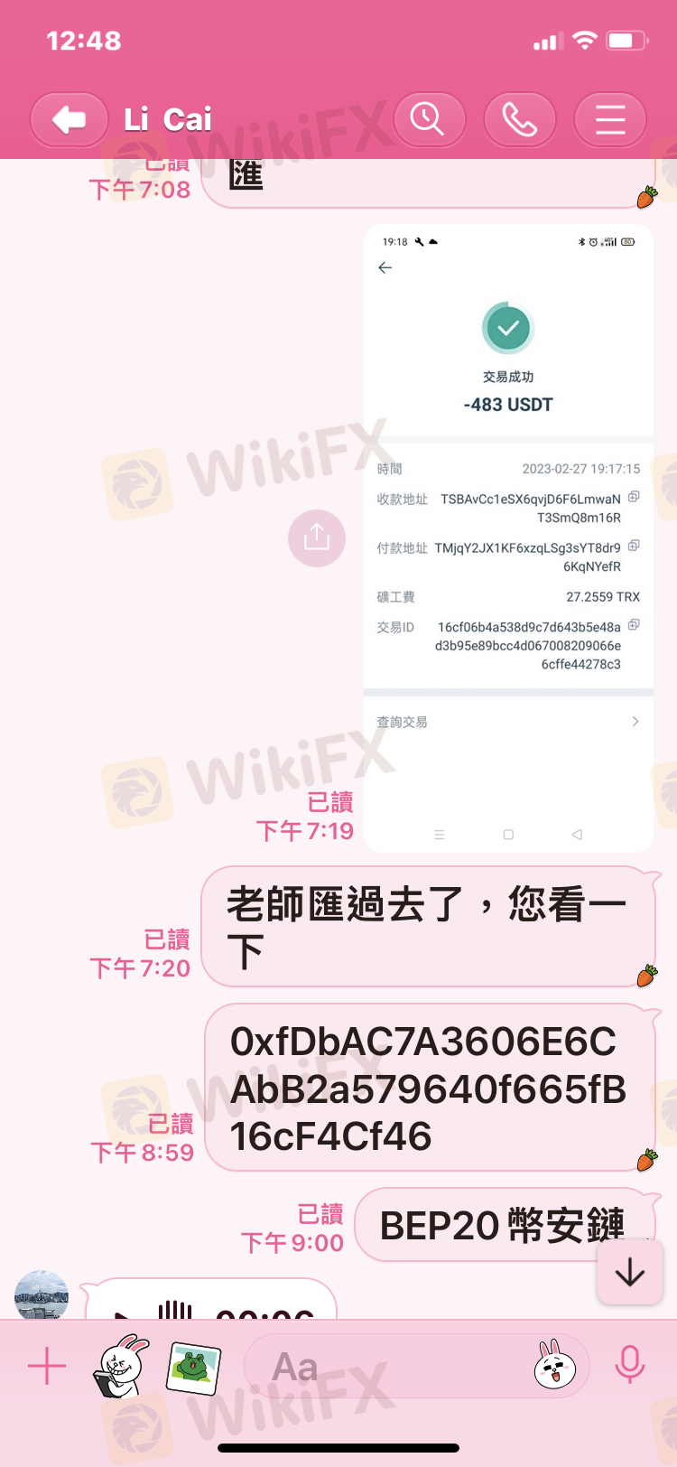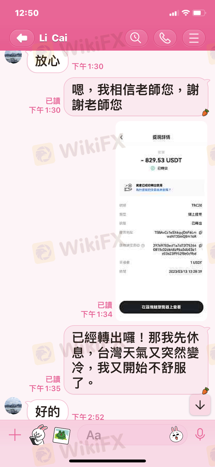 去年10月初投資美金程式打不開,分析師說公司怕我自己操作把錢輸光,他們該賺得錢就無法拿到,10月中旬我操作台有七萬多美金虛擬貨幣,要求出金,稅金,換線路的錢,政府公證的錢,我都付清,結果分析師說,客服那裡出狀況,無法出金,叫我等,後來又說可以出金,又沒出金,反反覆覆又教我下載交易所,匯給處理資金人員的紅包錢,分析師一直跟我在賴都有聯絡,還說他說,我是他的客戶,他會負責到底,不會吃掉我的錢,不然他封鎖我就好了,為什麼還要跟我賴,於是經過交易所也換美金虛擬幣匯給分析師四次,今年4月17號是最後一次匯美金虛擬貨幣,分析師還說放心會馬上處理,4月18號我的賴就沒有讀,我賴電也不接,真是可惡,我辛辛苦苦賺的錢也都被他騙走了,人在做,天在看,會有報應的