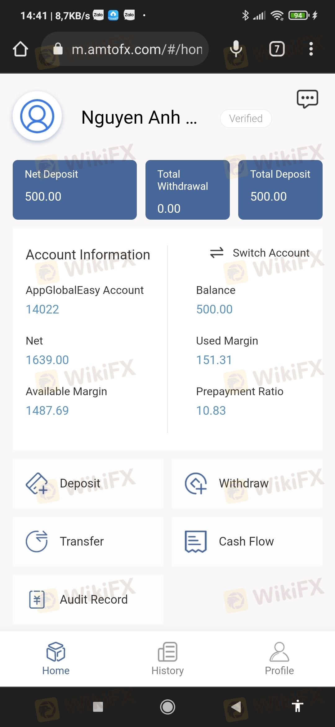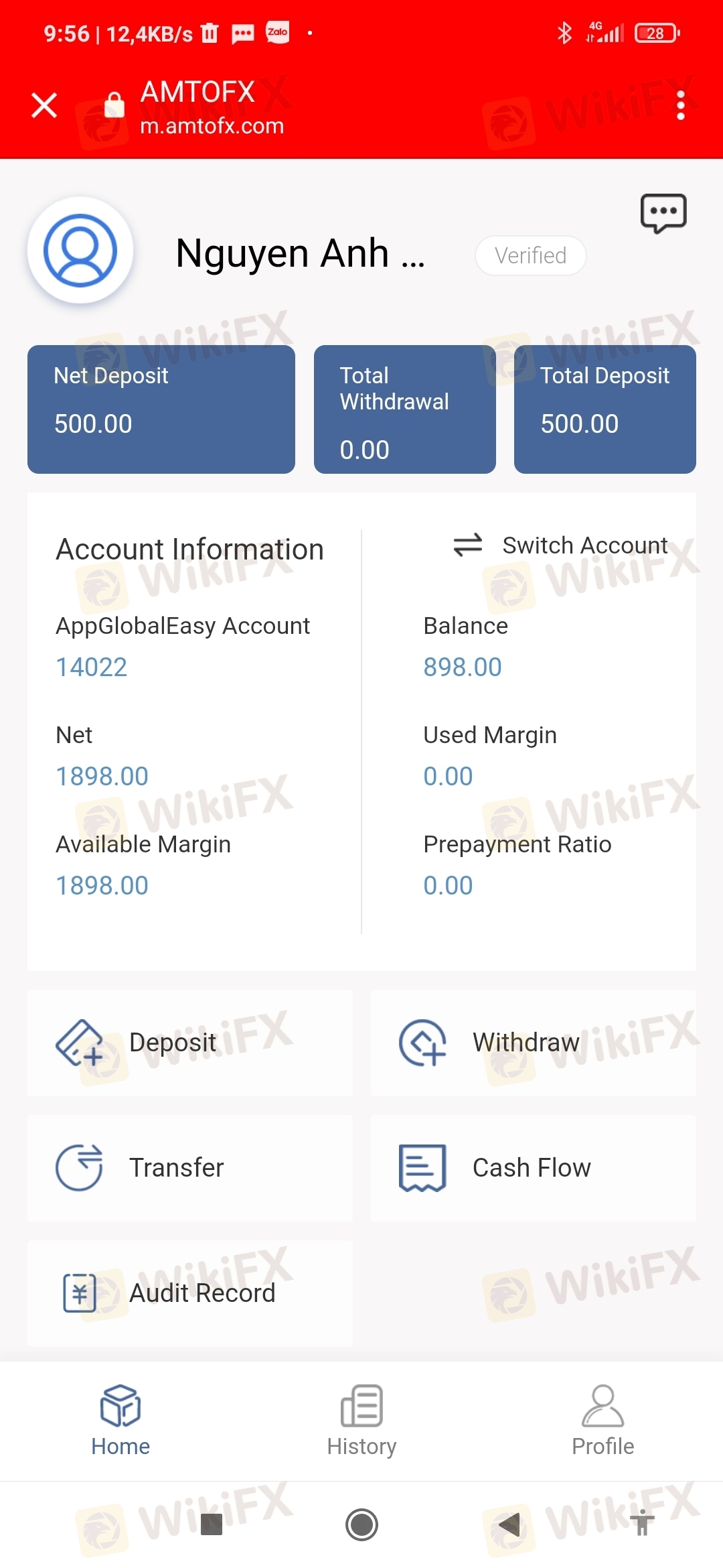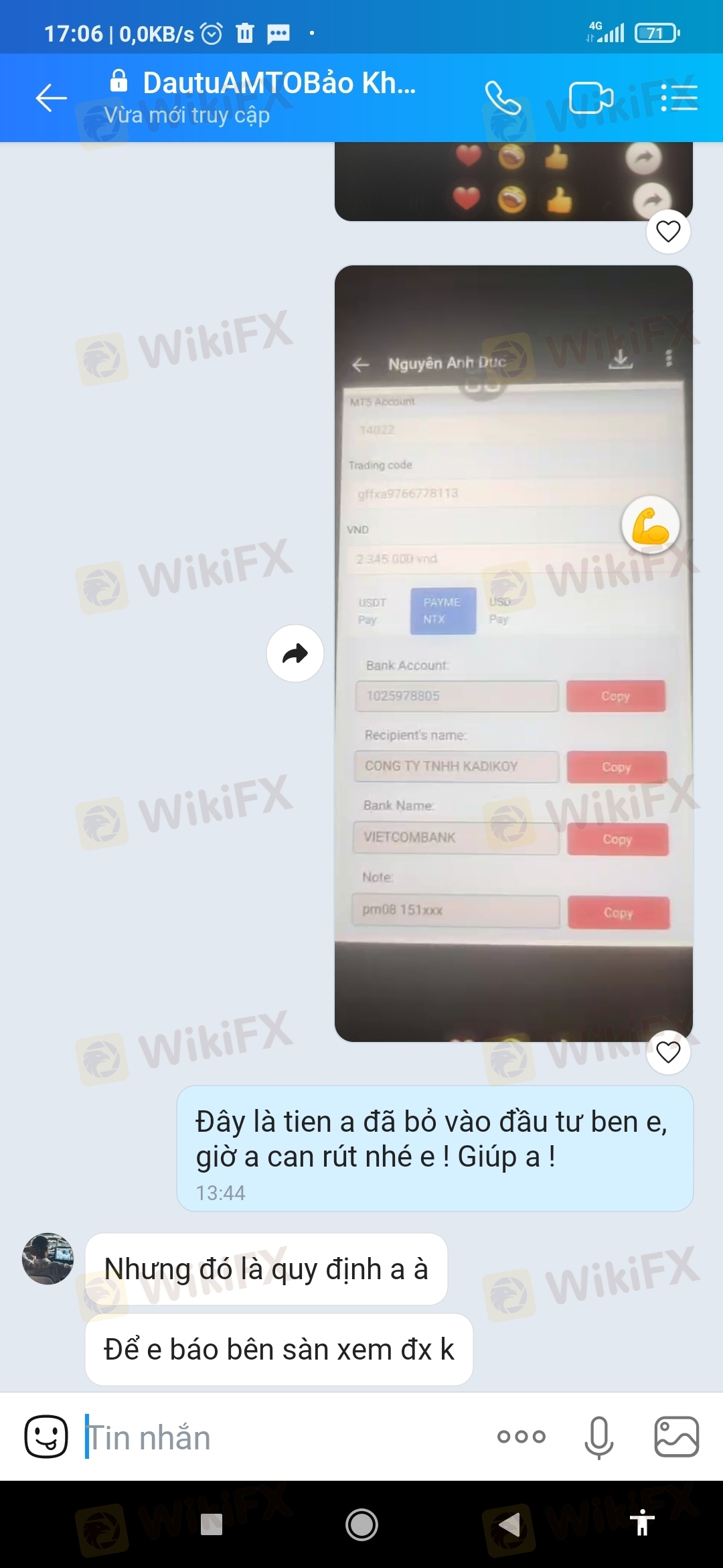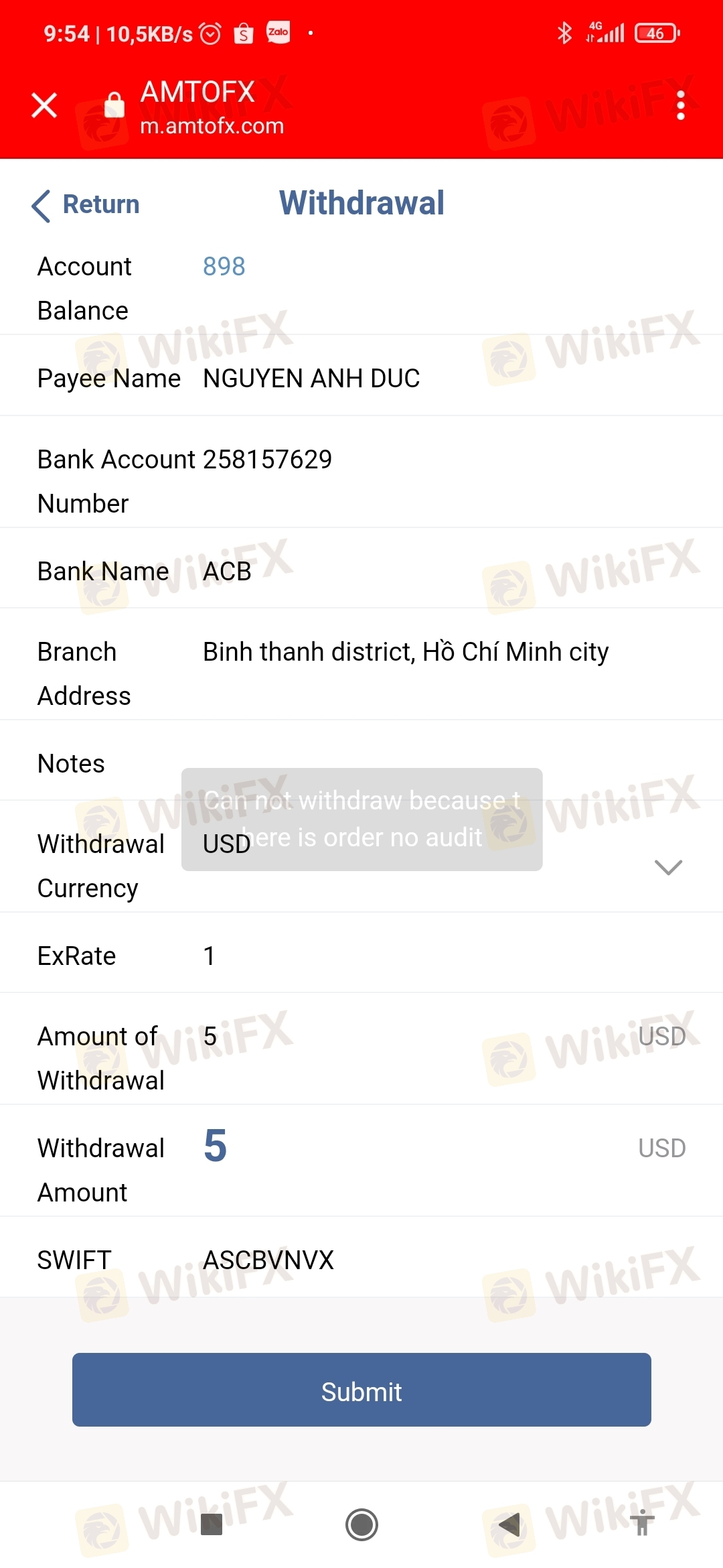 我在AMTOFX入金了500,赚了398美元,我从21/4/2023 开始从14022的账户中提取800美元!直到现在7/5/2023 钱还没有到我的银行? ?这是黑交易商? ! ?请帮帮我!