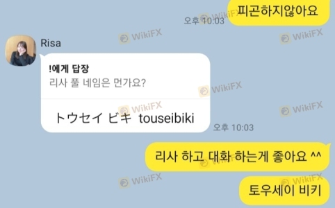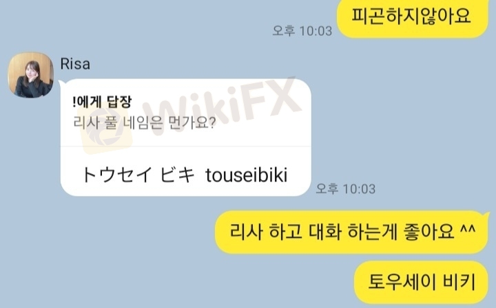 I'm not tired 10:03 PM Reply to Risa! Is Lisa's full name far away? トウセイ ビキ touseibiki 오후 10:03 리사 하고 대화 하는게 좋아요 ^^ It's the name of the broker Towsei Vicky