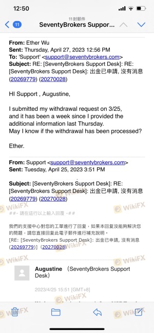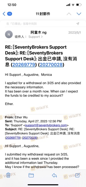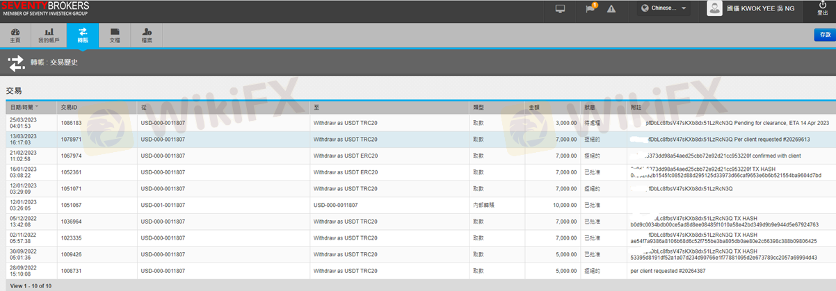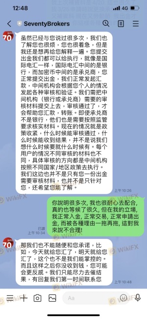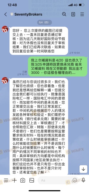 此平台我使用已經數年, 去年交易/出金還算正常, 但今年以來, 申請出金就很不順利, Seventy Brokers 告訴我因承兌商審批之原因, 請我把出金金額縮小由USTD 7,000 改到USTD 5,000 又改到USTD 3,000; 3月份我申請的一筆USTD 3,000出金, 到現在都一直沒到帳, Seventy Brokers 給我各種的原因, 請我繼續耐心等待, 我認為當中有很大問題, 而且這對使用者的權益造成很大影響。