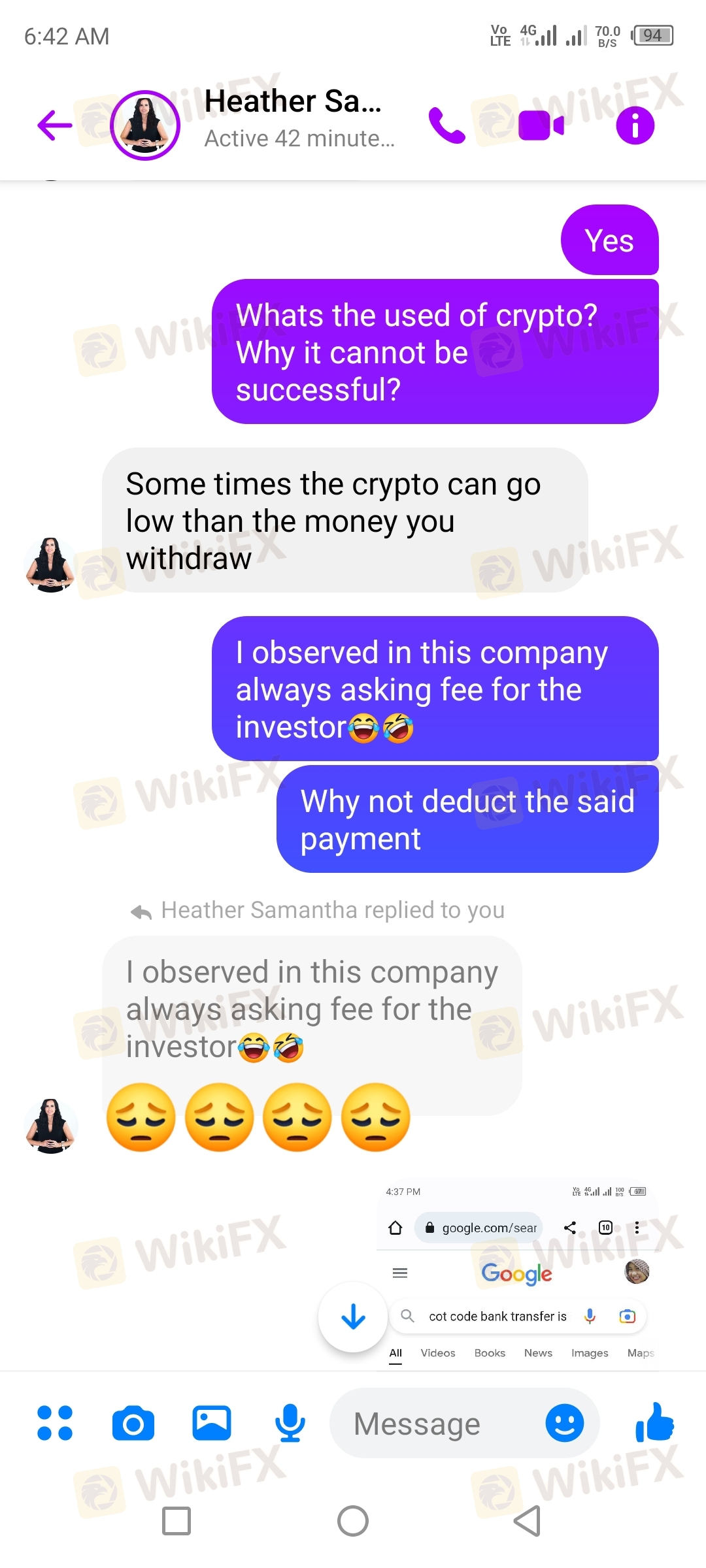 at first I invested a 5000 php for membership fee after 2 days they ask for a verification account fee of 50,000 php but I only send 30,000php so that I can withdraw my profit now here comes the withdrawal process at first I selected the Crypto withdrawal process but sad to say it always pending and they say that is under maintenance for 2mos and they say to proceed to a bank withdrawal so when I tried to withdraw the amount it ask for a COT code ..then the COT code cost 15,000 php.. so o did not pay the cot code...I think it is scam because that Samantha Heather is now not reachable in facebook and in telegram all our conversation is deleted includinf the said manager.