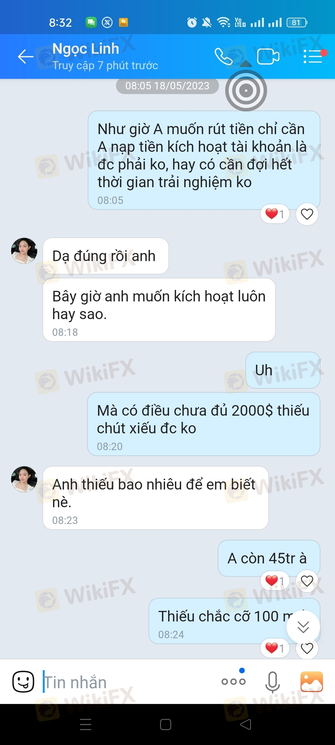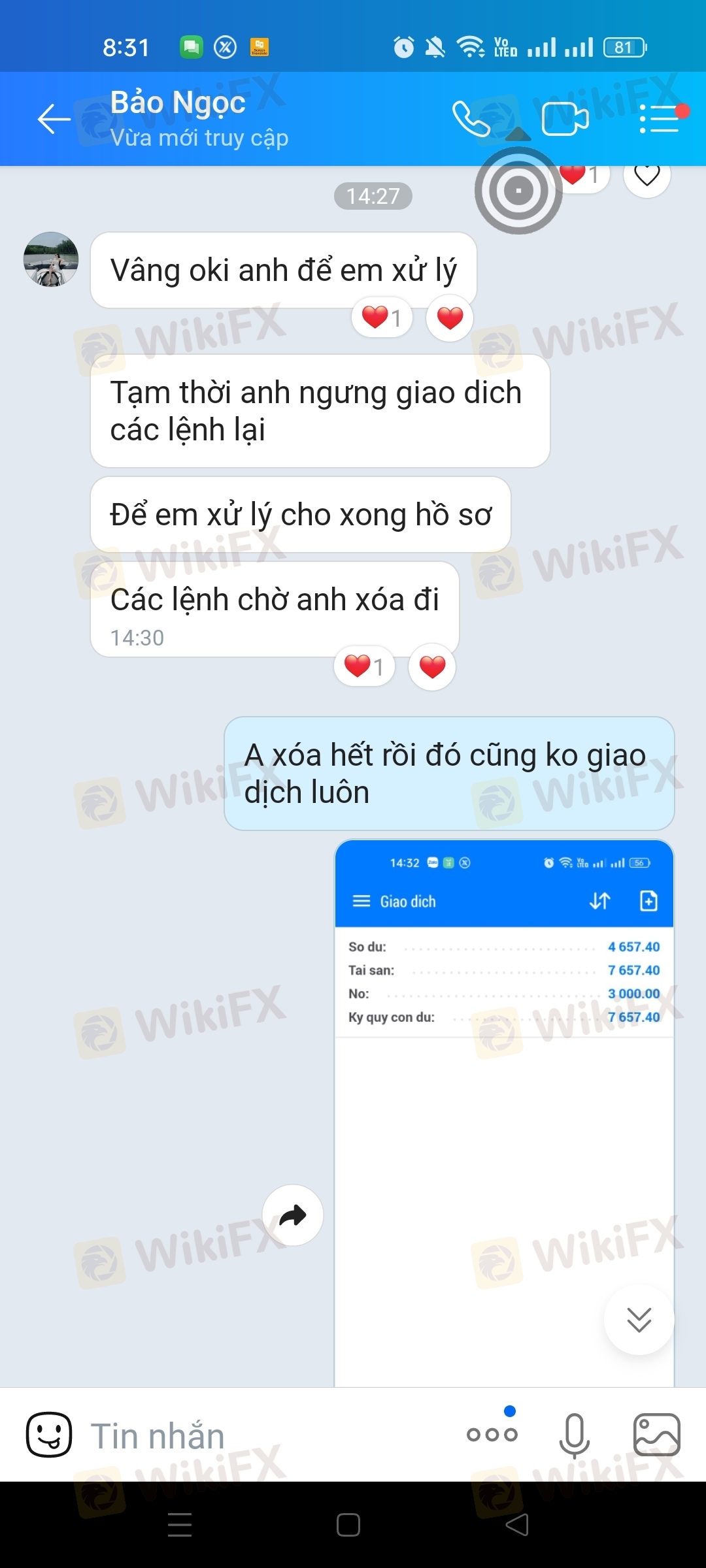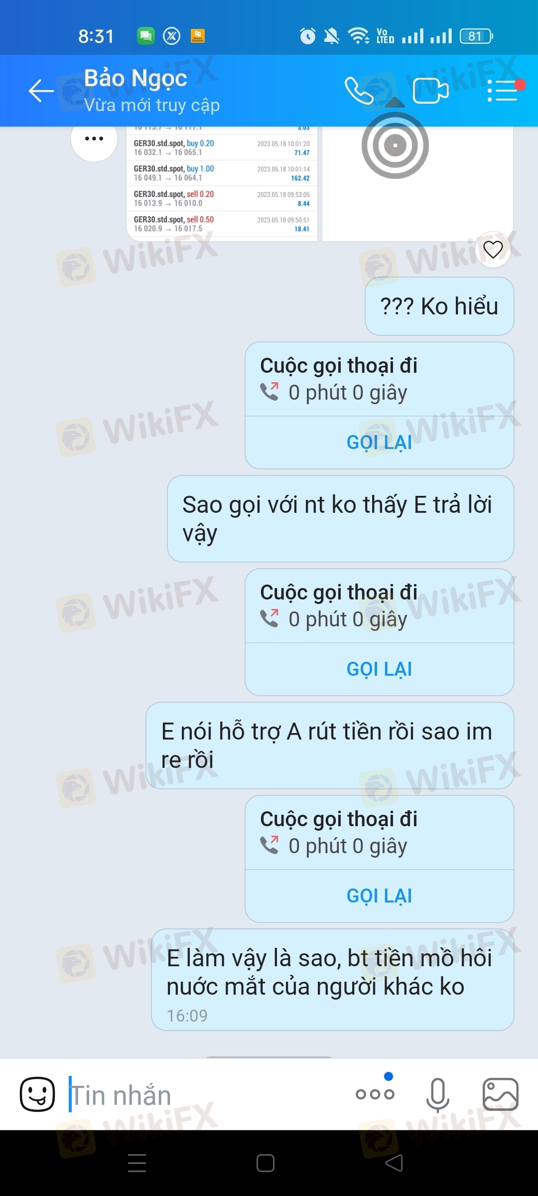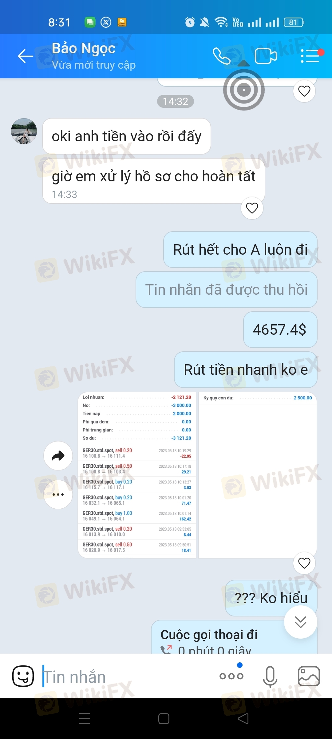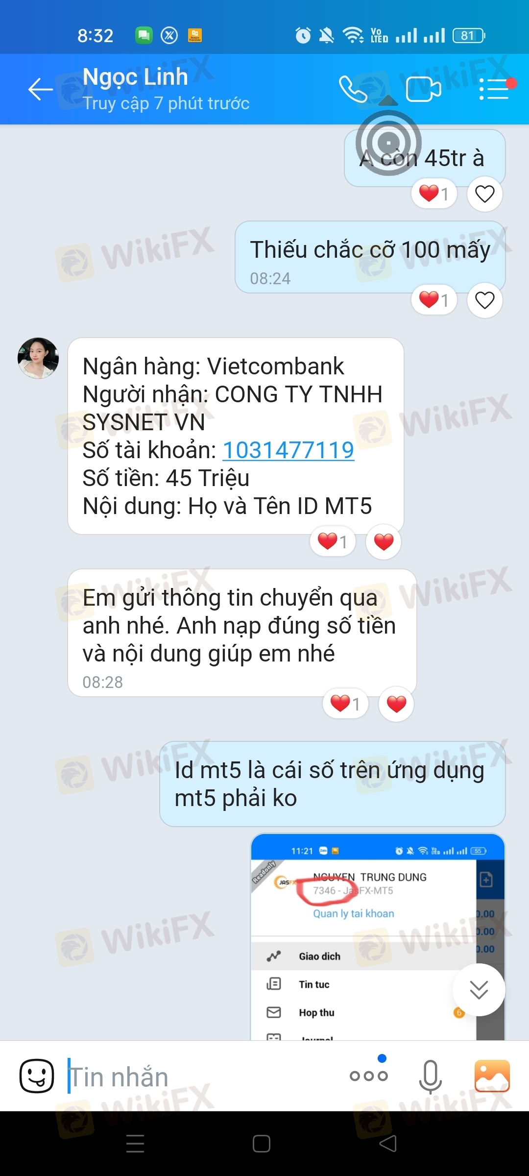 tôi đc nhân viên jasfx mời trải nghiệm miễn phí 3000$ và rút đc tất cả lợi nhuận sau 3-5 ngày với điều kiện phải nạp 2000$ để kích hoạt, sau khi giao dịch 2 ngày tôi có lợi nhuận 2657$ tôi muốn rút tiền, nhân viên jasfx yêu cầu tôi nạp 2000$ và tôi đã nạp tổng số tiền trong tài khoản tôi 4657.4$ , sau khi tôi nạp tiền và muốn rút tiền thì nhân viên jasfx dùng mọi cách để ngăn cản, nhưng tôi cuơng quyết tiền thì bị trừ đi 2157$ chỉ còn 2500$ tôi giao dịch thêm đc 2503.36$ , thấy ko ổn tôi làm lệnh rút luôn 2503$ về tài khoản và yêu cầu nhân viên jasfx hỗ trợ lệnh rút tiền về tài khoản cho tôi,lúc đầu thì hứa hẹn các kiểu...nạp rút tiền rất nhanh bất cứ lúc nào cũng đc,mà giờ ko liên hệ đc điện thoại nhắn tin các kiểu ko thấy trả lời, tôi đã làm lệnh rút tiền 2503$ hôm qua rồi mà hôm nay vẫn chưa thấy tiền về, tiền lợi nhuận 2157$ mất thì cũng ko nói đi, còn tiền vốn cũng ko thấy đâu luôn, với tôi nhớ thuờng thì khi làm lệnh rút tiền thì tiền trên ứng dụng mt5 với wep sẽ trừ tiền đi, còn đằng này trên ứng dụng mt5 với wep vẫn còn nguyên, coi bộ ko rút đc tiền rồi