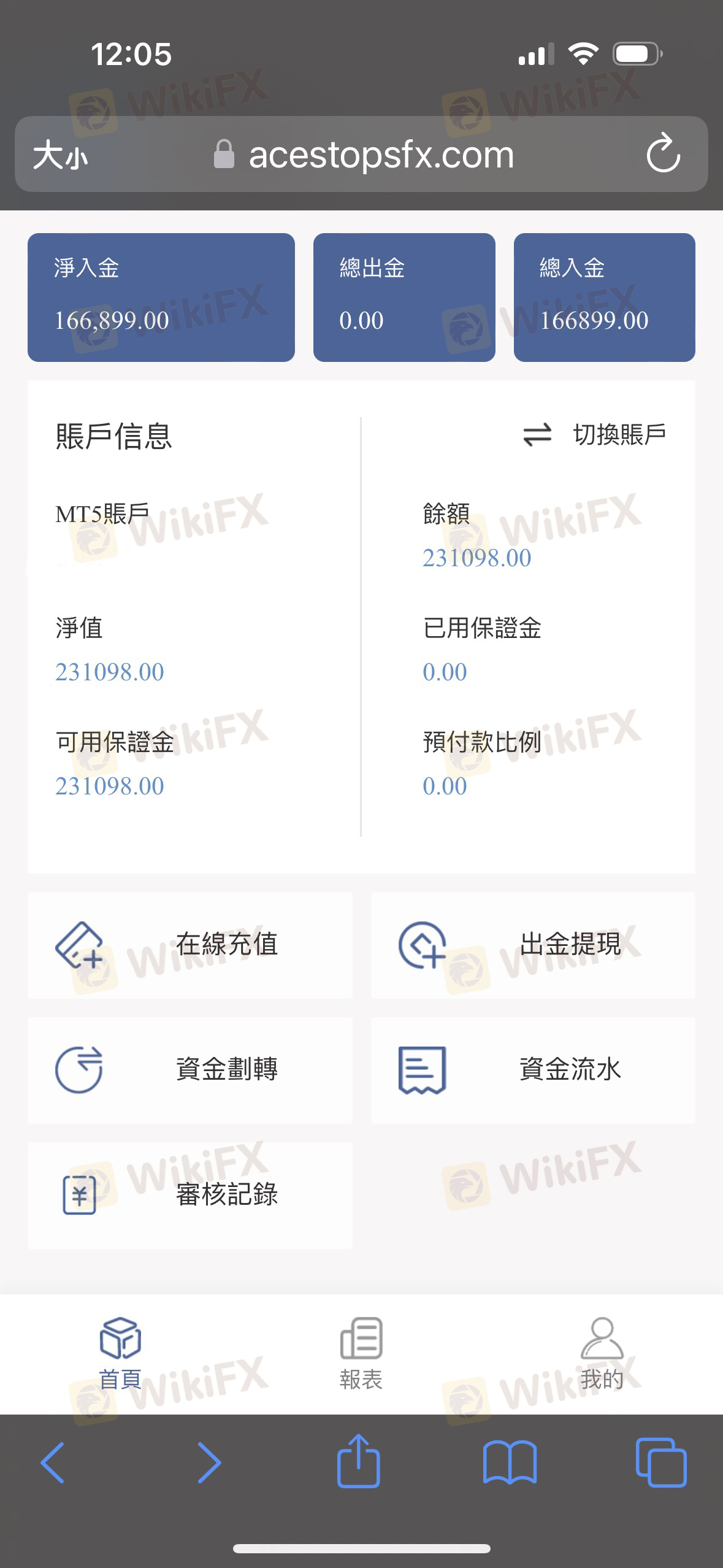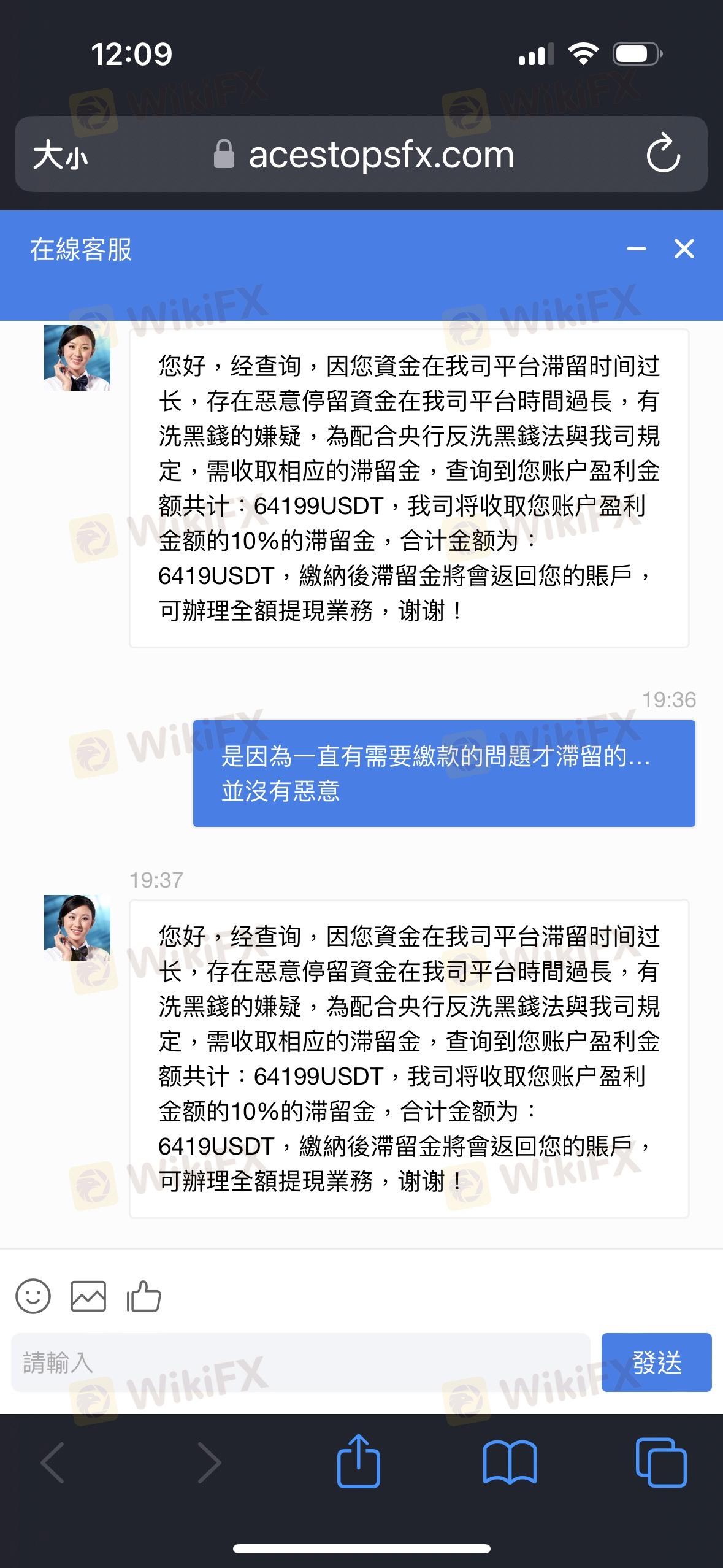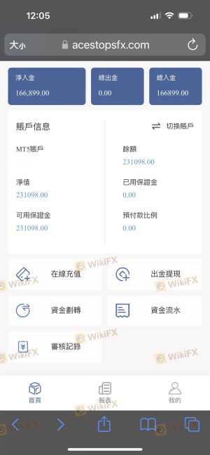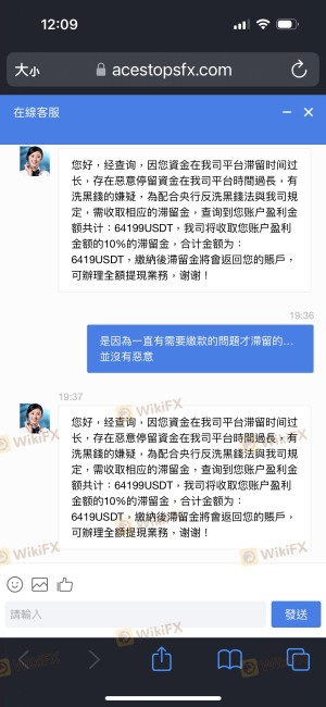 3月底透過網友介紹入金該平台,入金審核都很快速通過,交易也有獲利,來來回回總共入金10幾萬USDT,5月初帳戶內加上獲利已有20萬左右USDT,想申請出金,平台每一次審核都要求繳納各種費用,首先是開通黃金會員加快下款速度,要求再入金18888USDT,然後還送1888USDT,接著說要繳外匯稅務金,金額是帳戶總額的20.6%,並且只有7個工作日的期限,因本人之前已將所有資產全入金該平台,導致無法於期限內繳納,所以平台又要求收取一筆稅款20%的滯納金,此時距離第一次申請出金已經過了半個多月,在我以為終於可以提領的時候,平台又說我惡意停留資金時間過長,要求我繳納帳戶盈利10%的滞留金,此平台一次又一次拖延就是不給出金!另外,此平台已更改網域為https://m.acestopsfx.com/#/