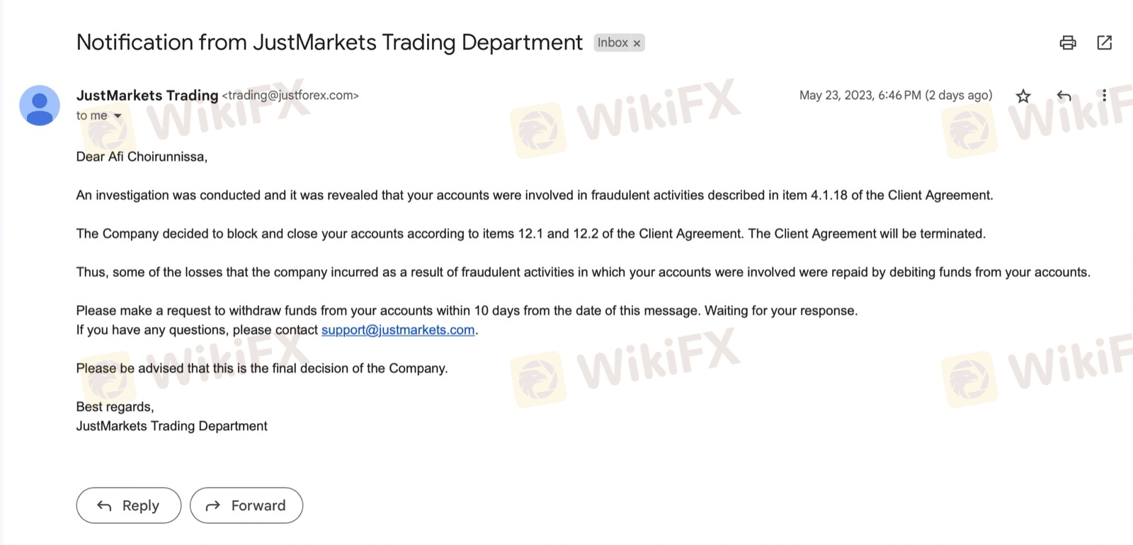 请小心这个经纪人,他们不想让你赢! !他们说我参与了欺诈活动,我显然没有参与! ! !并在没有任何其他解释的情况下冻结我的帐户。他们还拿走了我所有的利润并将我的余额调整为我的初始存款金额......远离这种不想让你获利的经纪人!下面附上调整前一天的账户调整和余额证明
