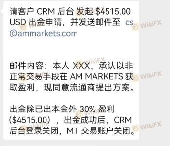 我在AMMarkets平台开户入金交易,因为赶上单边上涨行情我手里满仓多单,全部盈利没有亏损。就因为没有亏损平台说我违规交易,从5月4日申请出金一直不给处理,直到5月31号平台让我签霸王协议,就是盈利给一部分(30%)。我被逼无奈银行催收,网贷平台催着还钱,只能先拿回一部分解决眼前困难。剩下10532美金平台不给了,要求关闭我后台。这样的黑心????平台太恶心,平台黑我血汗钱。平台给的霸王条款如下:请客户 CRM 后台 发起 $4515.00 USD 出金申请,并发送邮件至 cs@ammarkets.com 邮件内容:本人XXX,承认以非正常交易手段在 AM MARKETS 获取盈利,现同意流通商提出方案。 出金除已出本金外30%盈利($4515.00),出金成功后,CRM后台登录关闭,MT交易账户关闭。这样的黑心????平台请大家来评评理为什么盈利不给,大家擦亮眼睛????不要再被AM平台黑钱,也请有关部门出来为我主持公道,还我血汗钱。本人承诺所说全部属实,如有虚构承担全部法律责任。