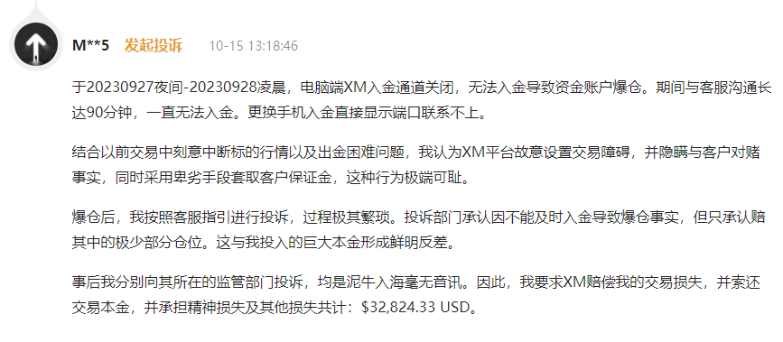 前几日,一位汇友投诉在XM平台无法入金。9月28日凌晨,汇友预料到订单需要追加保证金来防止爆仓,但是当时XM电脑端的入金通道已经关闭,与此同时,手机端入金端口也无法连接。汇友当时就找了XM平台的客服沟通入金事宜,与对方协调了一个半小时,最终也还是入金失败。这直接导致汇友的账户爆仓,损失了3万多美金。