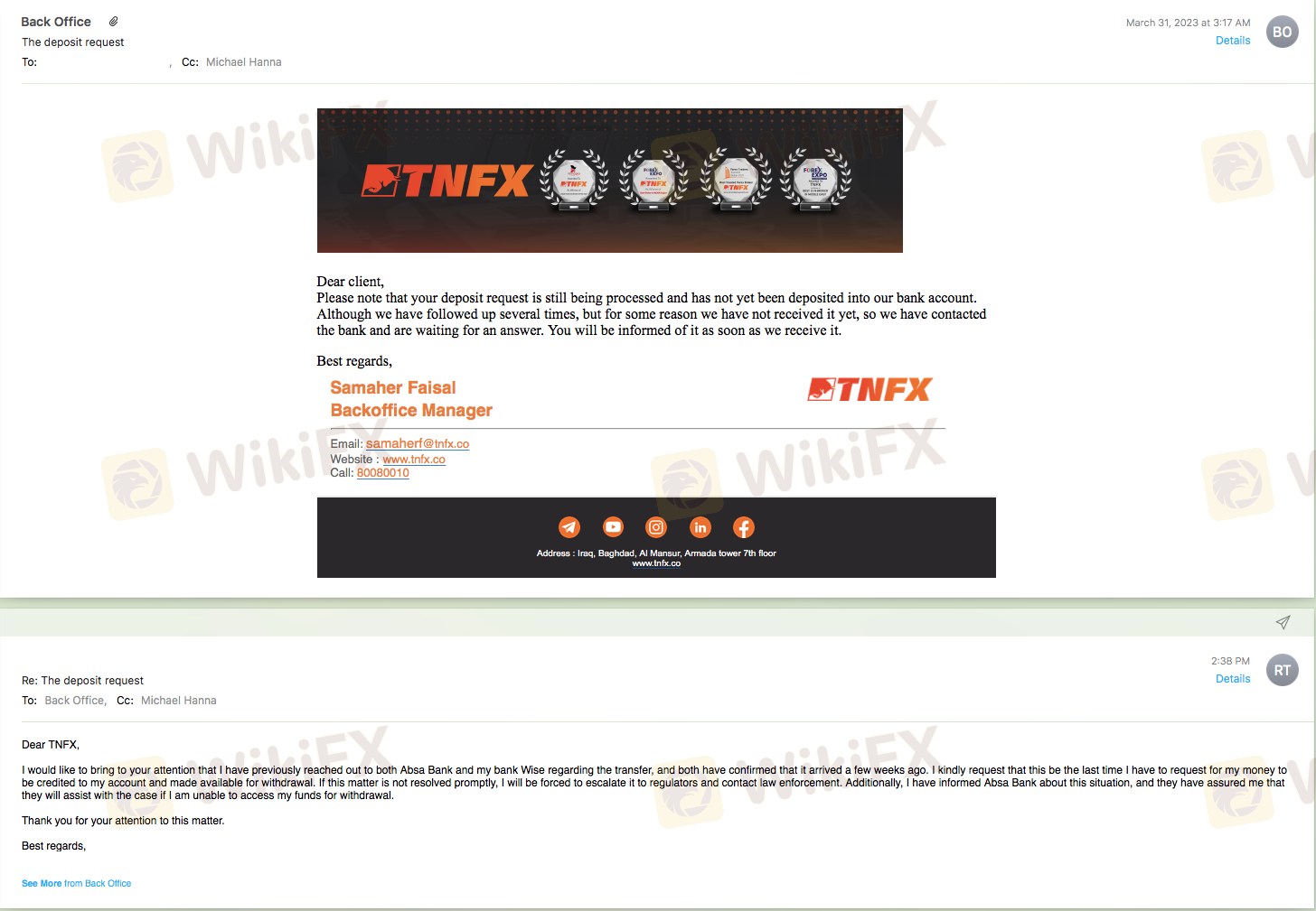 TNFX让我相信他们是一家黑公司。几个星期前我已经存了一笔钱,甚至在我和他们的银行核实之后,我的银行也确认转账已经到账,他们仍然声称他们没有钱。不要在这里存款。我不推荐。已经到达fsa 塞舌尔,他们声称在这件事上受到监管,并将继续采取任何其他必要的行动反对TNFX如果他们现在不继续进行并让我的资金可以提取,我什至不想与TNFX有任何业务往来了。