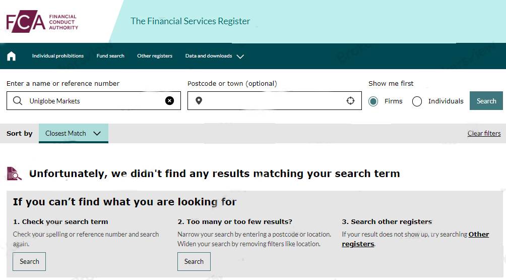 Since the company's address is located in the UK, it should be regulated by the FCA in the UK. However, no information matching "Uniglobal Markets" was found in the FCA, indicating that it is indeed not regulated by the UK FCA.