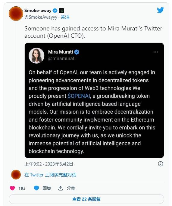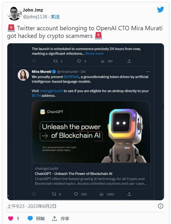 Murati's Twitter account has posted a hypothetical phishing link, which is a scam that mimics the popular OpenAI product ChatGPT. In addition, the post also promises to air drop the token OPENAI, which is said to be ERC-20.