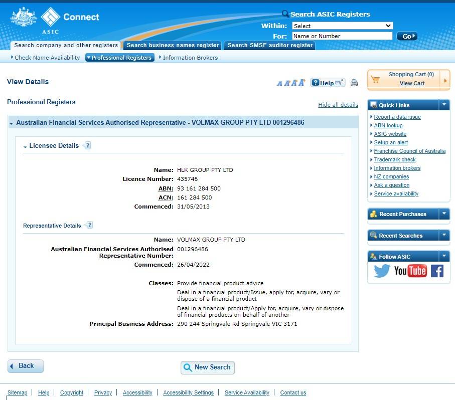 But the query results are not like this. Search for "00129648" on the ASIC official website, and the corresponding company name is "VOLMAX GROUP PTY LTD", which is an AR authorization license. The authorizer is a company named "HLK Group Pty Ltd". HLK Company, on the other hand, is a company that enjoys licensing AR licenses, and its licensing companies have had poor outcomes: FVP Trade was authorized by it, but it has already run away. Bond BDG is also authorized by it, but it has also run away; The Qimi stock index has also run away.