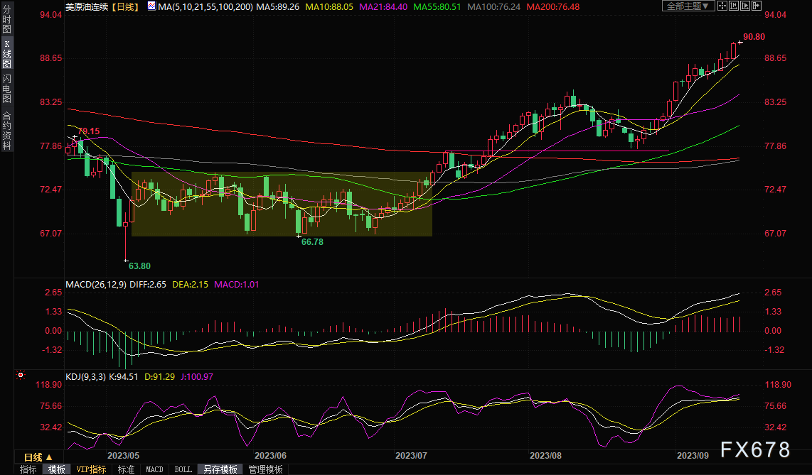 On Thursday (September 14th), gold prices remained below the 200 day moving average, and bearish impulses still persisted. The price successfully reached $1900, and there was a rebound in today's trading. Silver prices have been tested against previously formed fluctuating lows. After the price low point occurred, there was some rebound, and the price successfully rebounded close to the opening price. The bullish trend of crude oil prices did not encounter any resistance from bearish traders, and prices continued to rise and form higher highs.